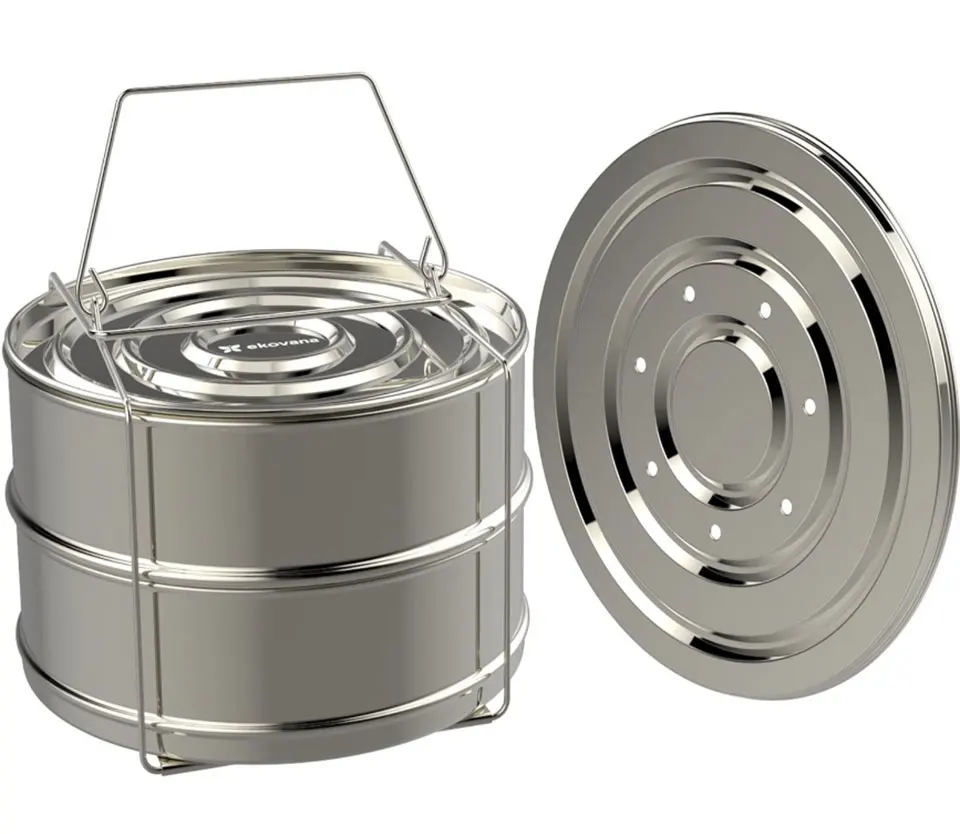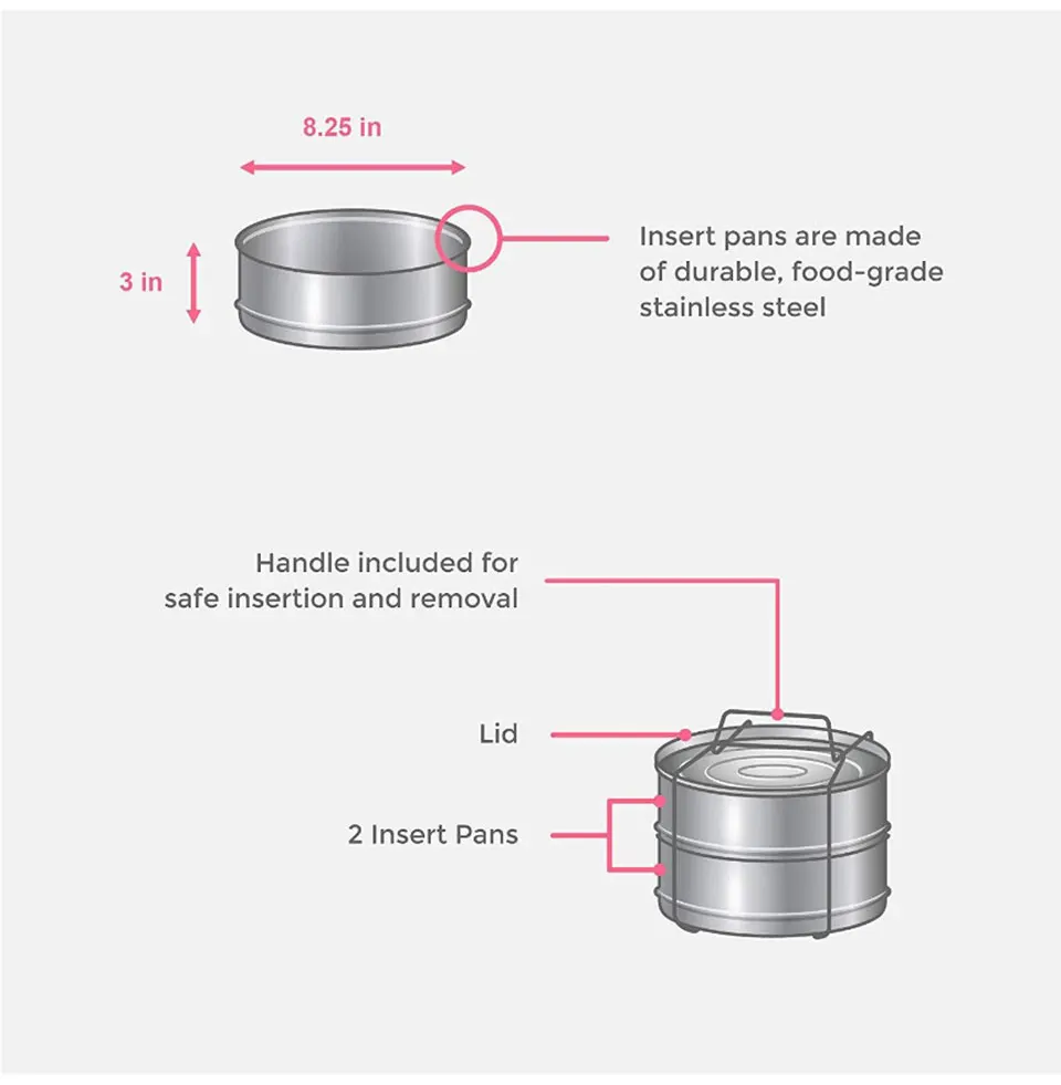 Универсальный-два уровня штабелируемые контейнеры для приготовления различных продуктов в отдельных контейнерах в то же время, отлично подходит для приготовления пищи в кастрюле, сохранения питательных веществ и витамины, таких как приготовление на пару риса, овощи, кукурузный хлеб, фарш, мясо или рыба. Его можно использовать в качестве десертной сковороды, чтобы сделать чизкейки или сделать лазанью. Также отлично подходит для быстрого повторного нагрева остатков без микроволновой печи.