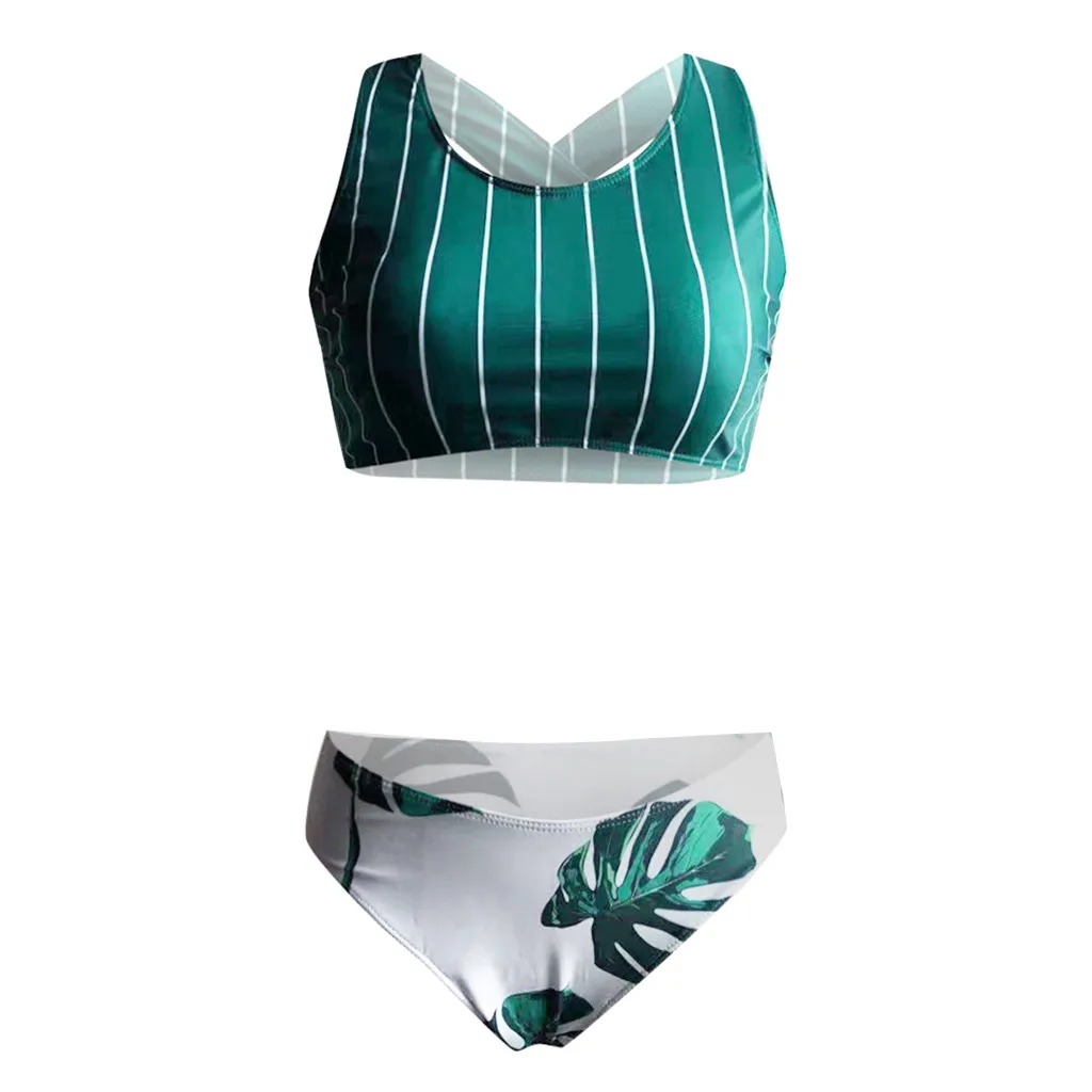 Женские сексуальные бирюзовые полосы Листья печати крест-накрест бикини купальник пляжная одежда