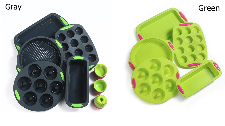 Бренд: pulisi Товар: силиконовая форма для выпечки, формы для торта Тип: Силиконовая сковорода для торта Цвет: серый, зеленый Посылка: 1 шт. в упаковке Температура Водонепроницаемость: не-4 ℉ ~ 464 ℉ Характеристики: духовка-микроволновая печь-морозильная камера-посудомоечная машина Размеры: (Силиконовая круглая форма для кекса) 8,93x8,93x1,96 дюйма/22.7x22.7x5cm (Силиконовая сковорода для тостов) 10,95x4,7x2,6 дюймов/27.8x12x6.5cm (Силиконовая посуда Tiramisu) 13,5x8,3x1,2 дюймов/34.2x21x3cm (Силиконовые 7 отверстий пончики сковородок) 10,3x11x1,2 inch / 26.3x28.3x3cm (Силиконовые 12 чашки кекс Пан) 11,8x8,15x1,06 дюймов/29.9x20.7x2.7cm