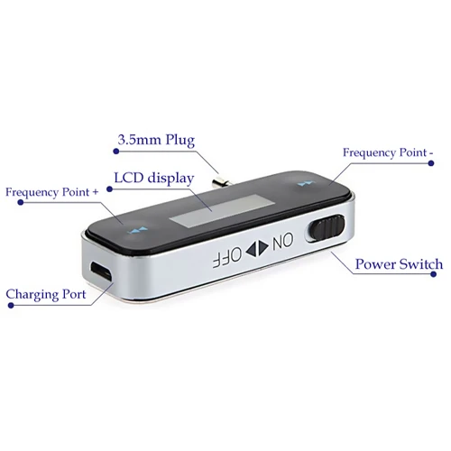 -Fm-передатчик для большинства мобильных телефонов. -Функция громкой связи обеспечивает вам большую безопасность во время вождения. -ЖК-дисплей с подсветкой. -С дизайном ключа Tonch, высокой точностью стерео. -Цифровой PLL, передача стабильна в различных средах. -Полный частотный диапазон. -Память для последней частоты. -Перезаряжаемая Встроенная литиевая батарея edny, не требует питания телефона.