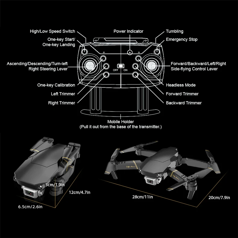 Функция: вверх/вниз, вперед/назад, влево/вправо, боковой полет, 3-й f светильник, светодиодный светильник, Безголовый режим, Аварийная остановка, режим удержания высоты, WiFi FPV