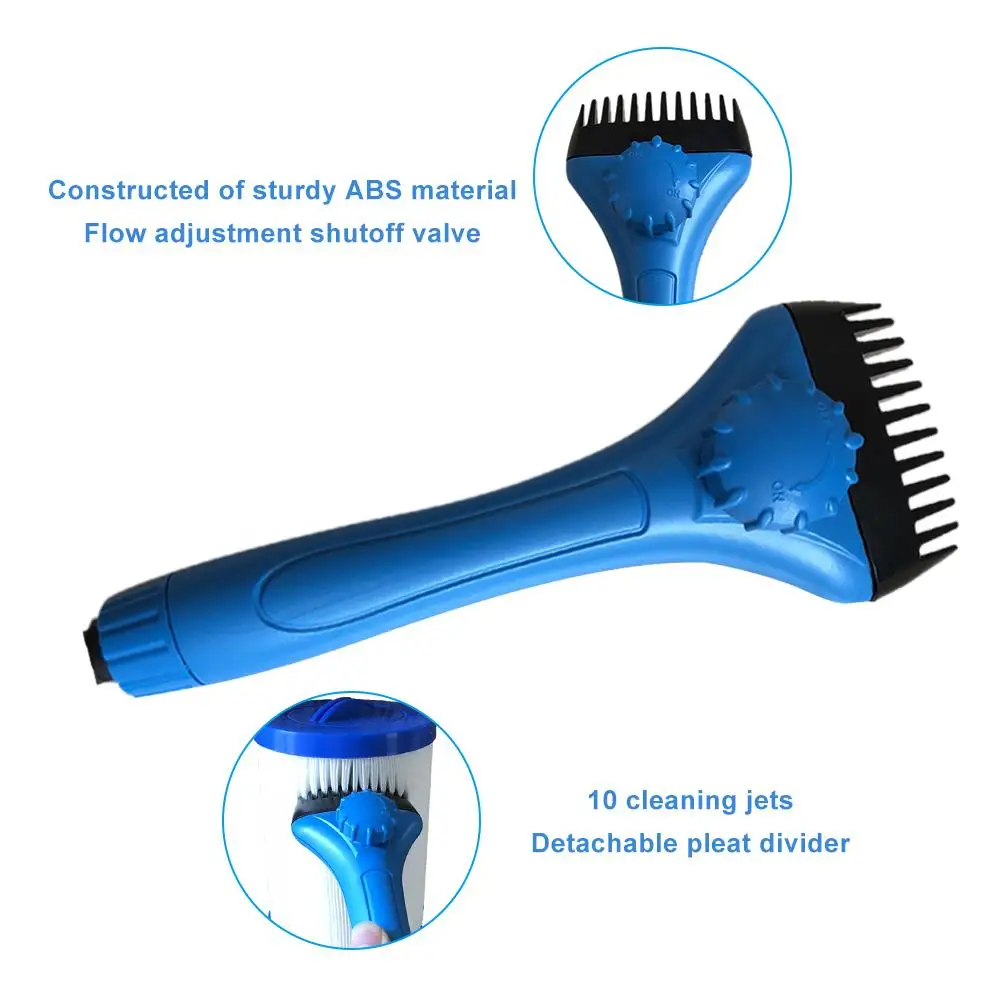 1. Улучшенная конструкция: 10 сопла для вентиляторов одновременно открываются и очищаются 10 складками. Без брызг. Очиститель картриджа удаляет мусор и грязь из фильтра за считанные секунды.1 * очиститель фильтра для бассейна