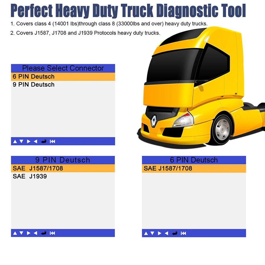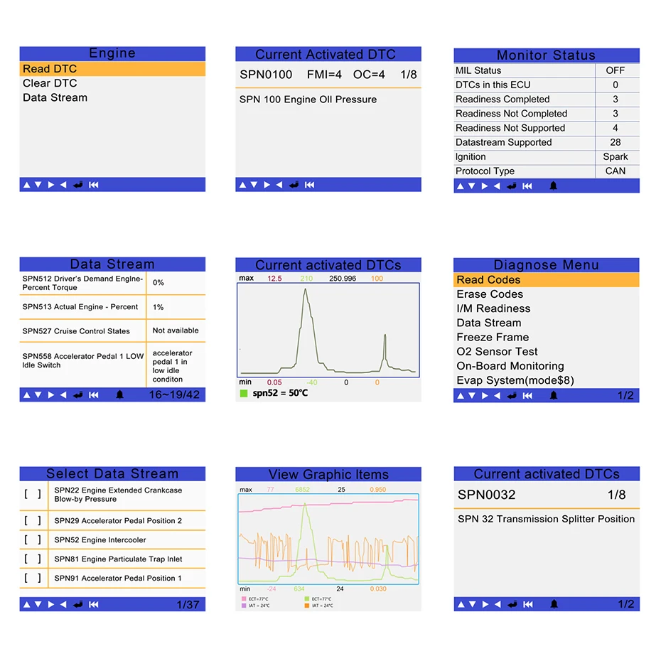 1. Чтение кода неисправности 2. Четкий код неисправности 3. Чтение потоков данных 4. Поддержка нескольких ECUs 5. Поддержка 6PIN, 9PIN и 16PIN диагностических разъемов 6. Поддержка J1939 и J1708 протоколов автомобильной связи 7. С несколькими языками (английский, французский, испанский, русский, немецкий) 8. С функцией онлайн обновления программного обеспечения (USB2.0)