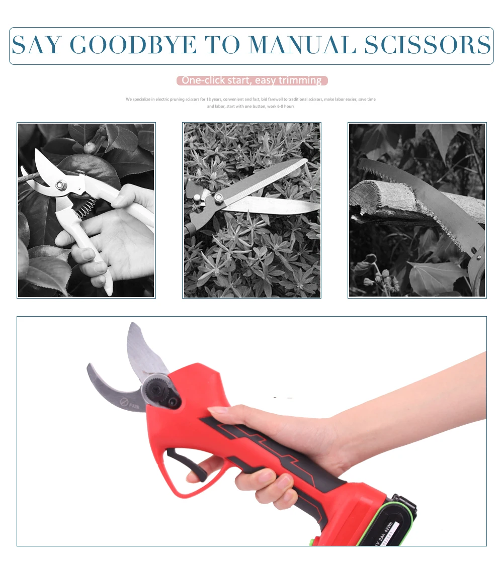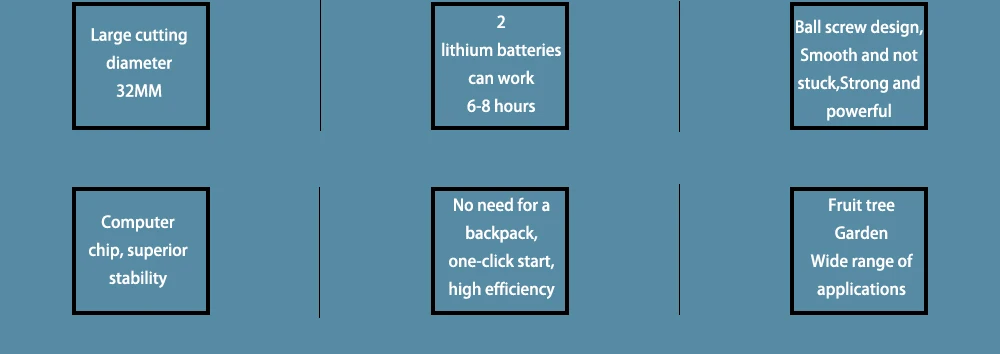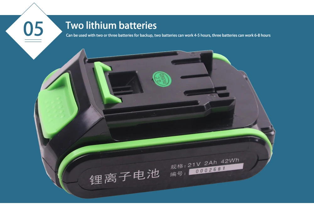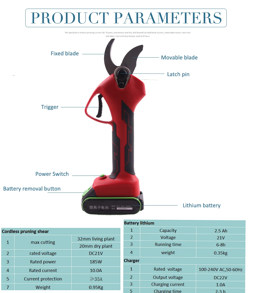 Спецификация Беспроводные секатора ножница 1 Макс резки 32 мм живое растение 20 мм завода по производству сухих 2 Номинальное напряжение DC21V 3 Номинальная Мощность 185 Вт 4 Номинальный ток 10.0A 5 токовой защиты ≥35A 7 Вес 0,95 кг Батарея литиевая батарея 1 Ёмкость 2,5 Ач 2 Напряжение 21 V 3 Время работы 6-8 ч 4 Вес 0,35 кг Зарядное устройство 1 Номинальное напряжение 100-240 В переменного тока, 50-60 Гц 2 Выход напряжение DC22V 3 зарядный ток никель-металл-1.0A 5 время зарядки 2-3 ч
