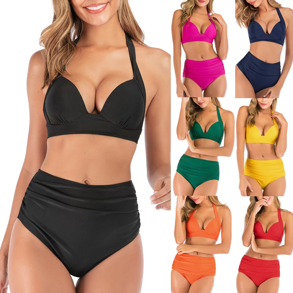 Пикантные желтые купальник Для женщин бикини пуш-ап, купальник, ванный Комплект Топ c бретелькой через шею Высокая Талия бикини комплект, состоящий из универсального размера плюс купальники