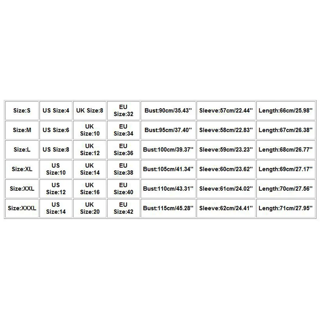 Размеры Нам Размеры UK Размеры ЕС Размеры Обхват груди Рукава Длина S 4 8 32 90 см/35,43'' 57 см/22,44'' 66 см/25,98'' М 6 10 34 95 см/37,40'' 58 см/22,83'' 67 см/26,38'' L 8 12 36 100 см/39,37'' 59 см/23,23'' 68 см/26,77'' XL 10 14 38 105 см/41,34'' 60 см/23,62'' 69 см/27,17'' XXL 12 16 40 110 см/43,31'' 61 см/24,02'' 70 см/27,56'' XХХL 14 20 42 115 см/45,28'' 62 см/24,41'' 71 см/27,95''