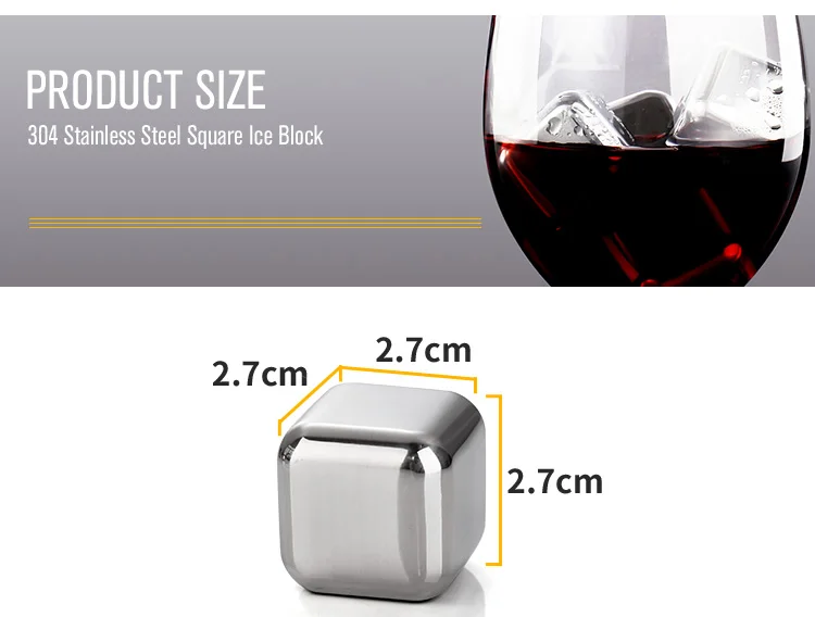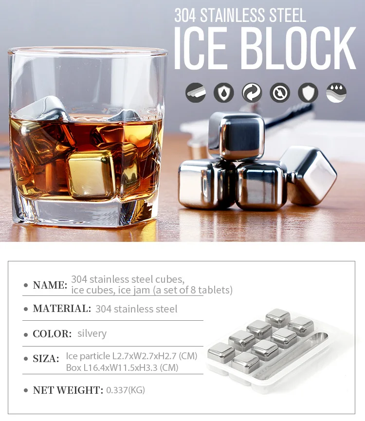 Введение продукта Товар: кубики льда для виски из нержавеющей стали (4 шт./компл., 6 шт./компл., 8 шт./компл.) Размер: 1,05x1,05x1,05 дюйма/2,7*2,7 *.27 см (прибл.) Материал: высококачественная нержавеющая сталь + хладагент Время доставки: в течение 3 дней Как использовать: 1. Краску ледяных камней из нержавеющей стали. 2. Положите в морозильник 4 часа перед использованием, для охлаждения напитков. 3. Подавайте 1-3 камня, чтобы охладить напиток, дайте выдержать 5 минут или более. 4. Промыть использованные камни и положить обратно в морозильник. Внимание: 1. Краску и сухие камни на воздухе после каждого использования. 2. Храните нержавеющие кубики в морозильной камере в следующий раз. 3. Тщательно краску перед первым использованием. 4. Не жевать и не глотать, получить его своевременно. 5. Не использовать в качестве игрушки, скажите вашим детям.