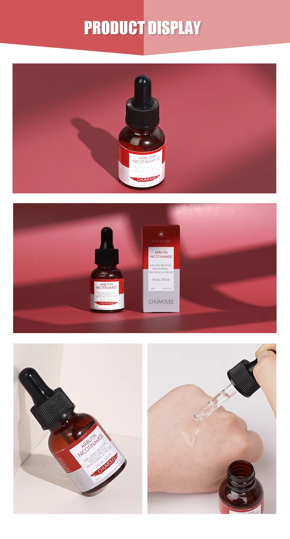 Содержит арбутин и никотинамид, может быстро проникать в кожу, эффективно препятствует активности тирозиназа в коже, блокирует образование меланина, И непосредственно сочетаются с тирозиназой для ускорения разложения и выведения меланина. Уменьшает пигментацию кожи, удаляет пятна и веснушки и не вызывает токсичных, раздражающих, аллергенных воздействий на меланоциты, делает кожу яркой и гладкой