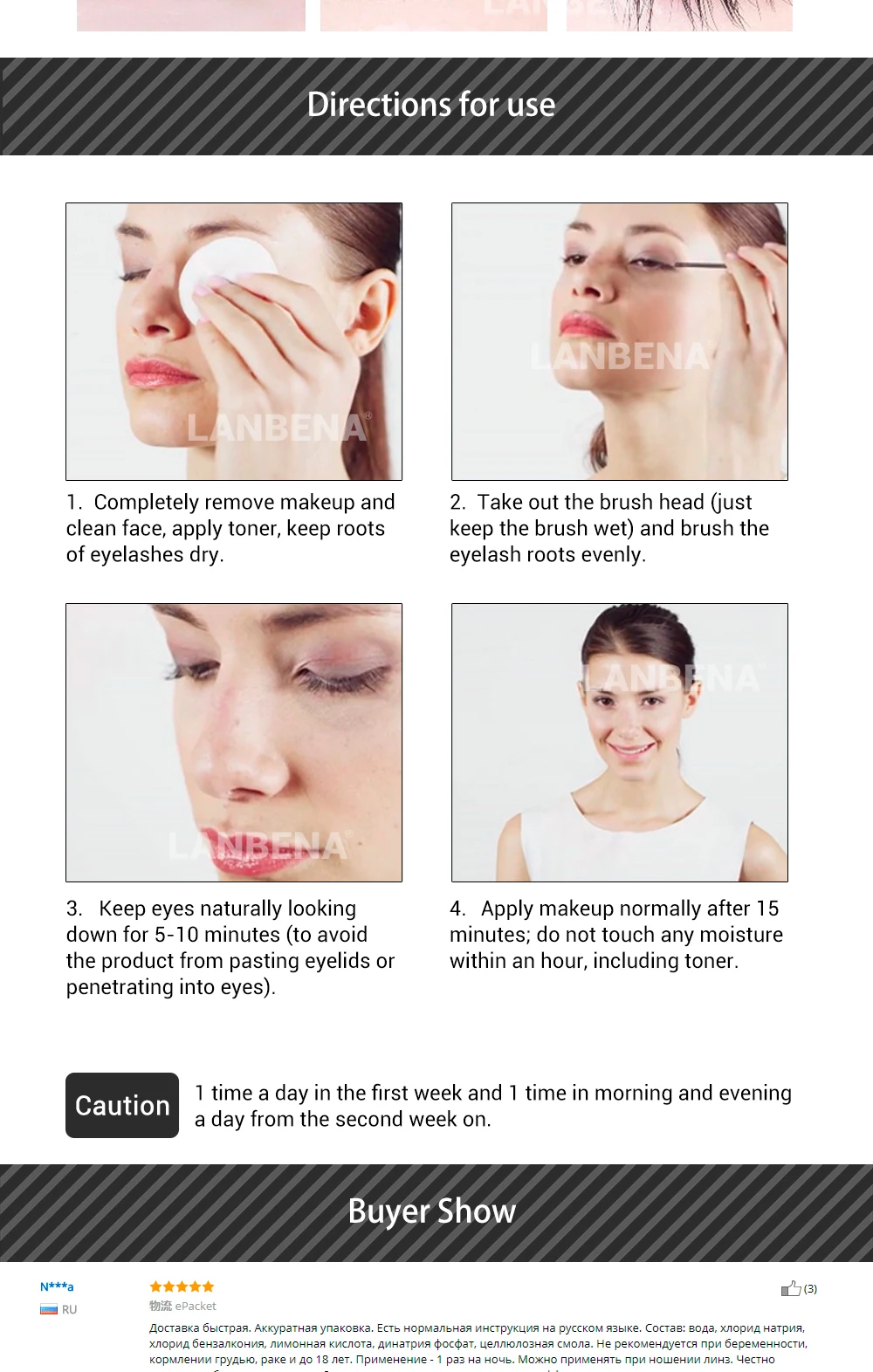 Название продукта L ANBENA Сыворотка для роста ресниц Нетто wright: 0,15 floz(= 4,5 мл) Состав: очищенная вода, хлорид натрия, бензалконий хлорид, лимонная кислота, динатрий Фосфат, целлюлоза. Эффективность: увеличение длины, толщины и темноты ресниц
