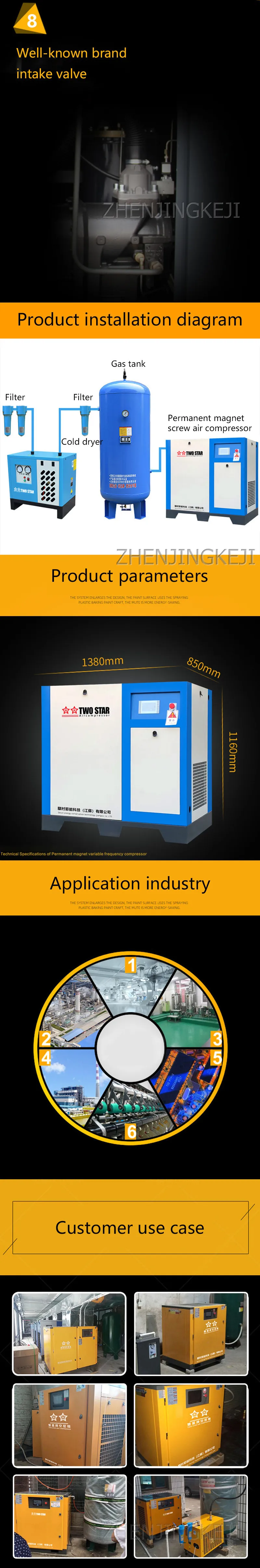Модель: FLDK-11K Напряжение: 380V Частота: 50 Гц Мощность: 11KW Давление: 0.8Mpa Смещение: 1.65м3/мин Температура окружающей среды: -5 ~ + 45 ℃ Метод охлаждения: воздушное охлаждение Смазка сумма: 18L Метод запуска: запуск переменной частоты Вес: 230 кг Размер: 1060*700*1070 мм