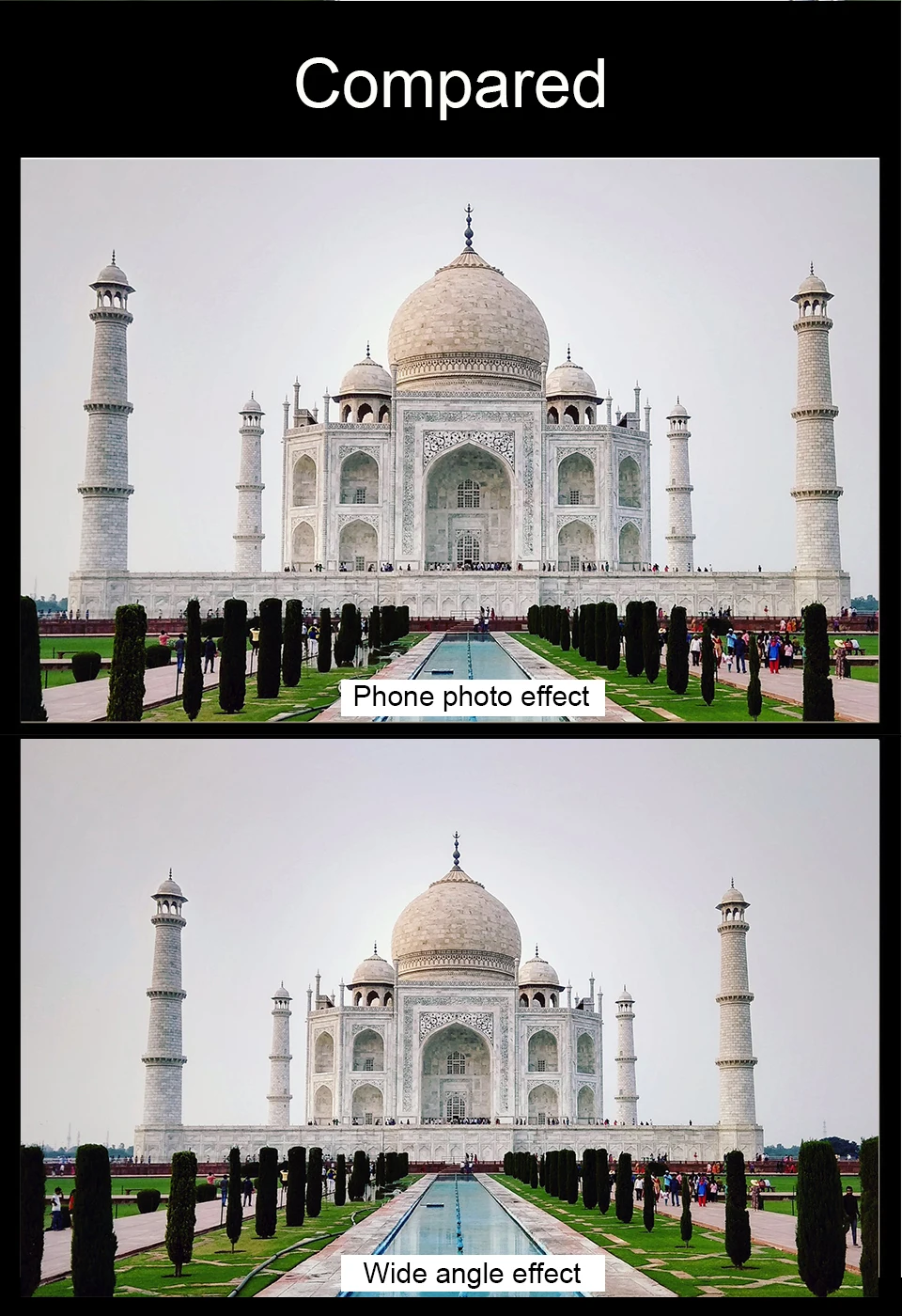 Может увеличить угол съемки мобильного телефона на 60%.