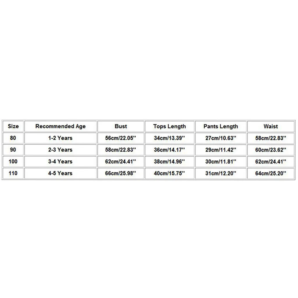 Размер Рекомендуемый возраст Обхват груди Топы Длина Брюки Длина Обхват талии 80 Для детей от 1 до 2 лет 56 см/22,05'' 34 см/13,39'' 27 см/10,63'' 58 см/22,83'' 90 От 2 до 3 лет 58 см/22,83'' 36 см/14,17'' 29 см/11,42'' 60 см/23,62'' 100 От 3 до 4 лет 62 см/24,41'' 38 см/14,96'' 30 см/11,81'' 62 см/24,41'' 110 От 4 до 5 лет 66 см/25,98'' 40 см/15,75'' 31 см/12,20'' Высота голенища 64 см; 25,20''