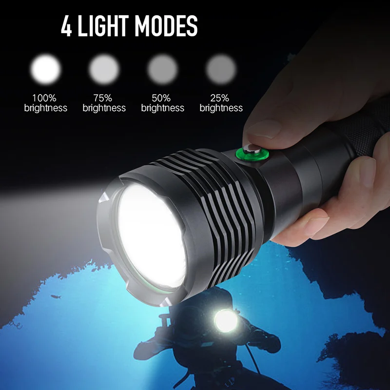 В посылка: 1 x Фонарик для дайвинга (без аккумулятора, зарядного устройства) B посылка: 1 x фонарик для дайвинга 1 x Зарядное устройство 2x18650 батарея C посылка: 1 x фонарик для дайвинга 1 x Зарядное устройство 2x5000 мАч 26650 батарея