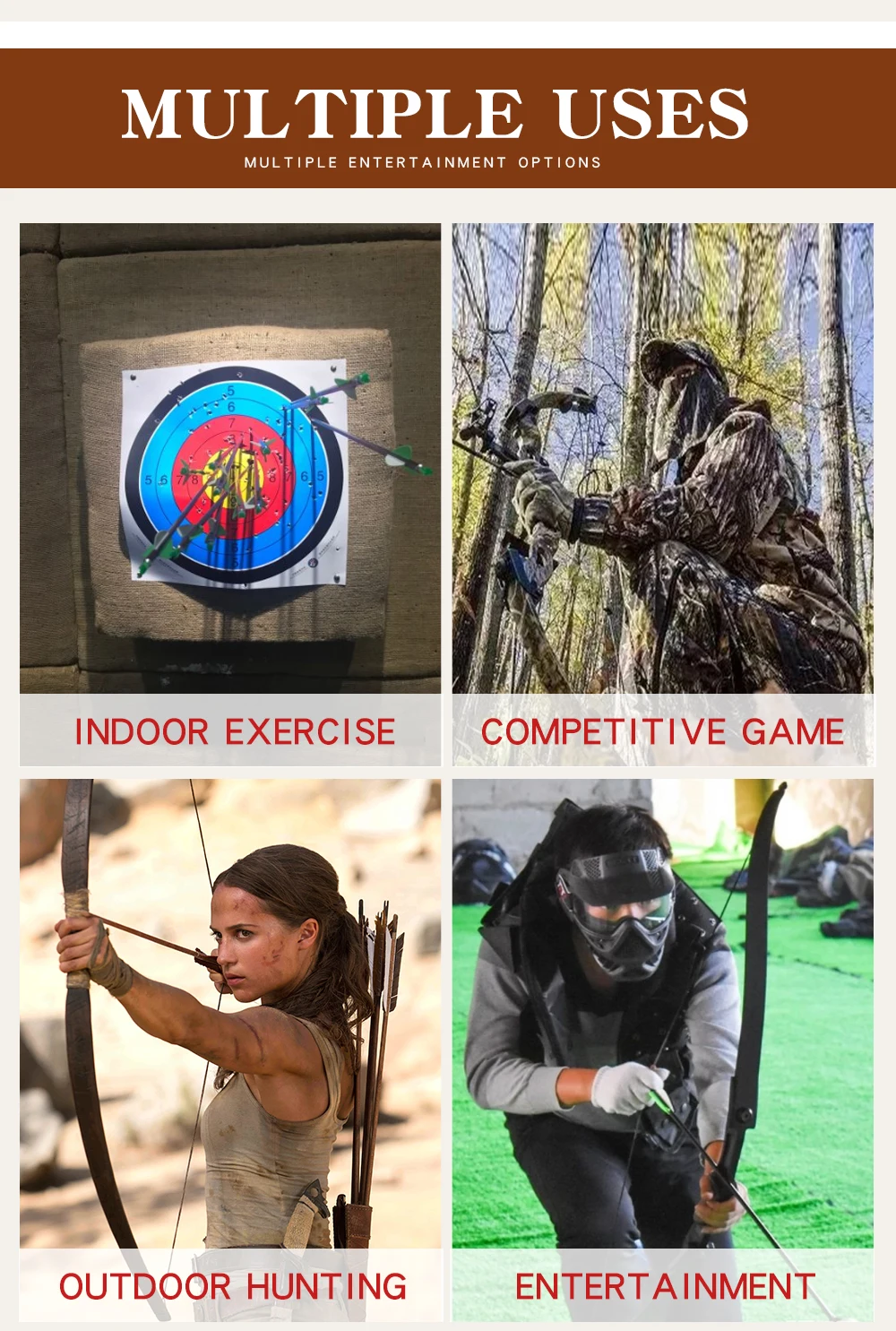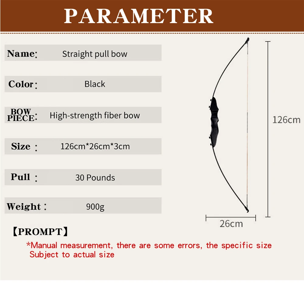 Прямой лук Цвет: черный, хаки Рисовать Вес: 30 /40 фунтов Длина банта: 51" Материал банта: высокопрочное волокно Материал ручки: дерево Вес: около 900 кг Особенности: Бант имеет прочную текстуру, прочность и прочность Гладкая гладкая отделка в полости шнурка для максимальной защиты bowstring Назначение: для легкой атлетики, стрельбы, охоты Хорошая эластичность и высокая эффективность Используется для: тренировки стрельбы из лука для молодых людей и взрослых Будьте осторожны при использовании