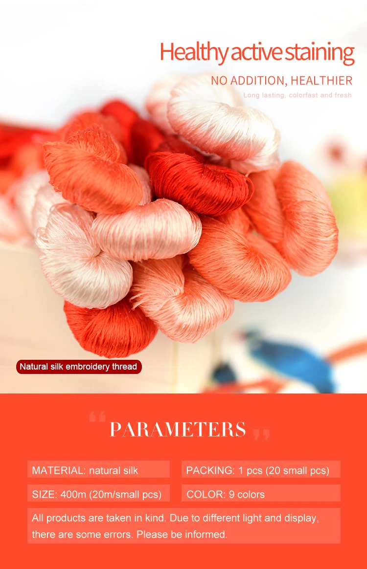 400 м чистый цвет вышивка нить/DIY ручная вышивка/аксессуары ручной работы/оранжевая Серия Особенности: 1.100% шелк и высокое качество, подходит для Сучжоу ручной вышивки. 2. Длина: 400 метров (20 метров/маленький кусок) 3. У вас есть девять цветов на выбор 4. Пожалуйста, обратите внимание, что в зависимости от дисплея, продукт может производить некоторые различия в цвете, пожалуйста, знать и понять эту ситуацию. Упаковка: 1 шт. (включая 20 маленьких штук)
