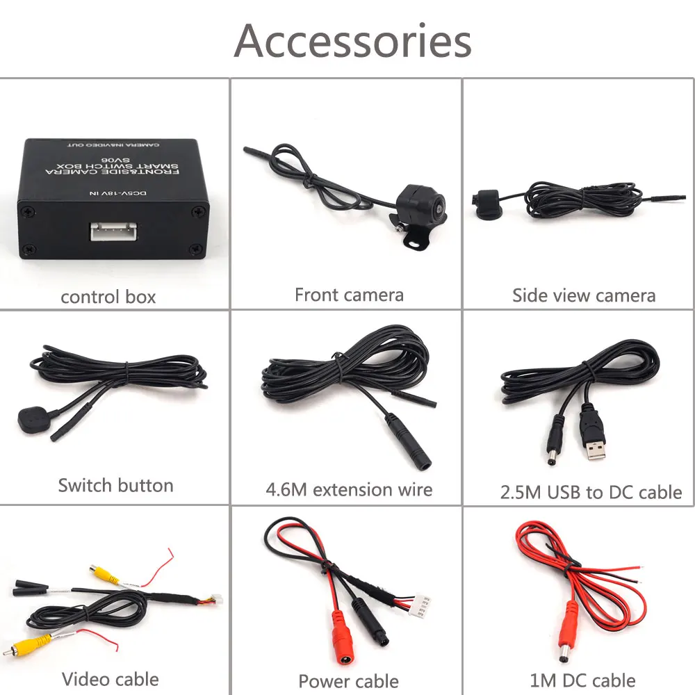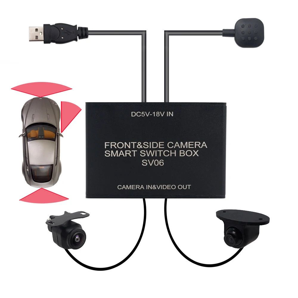 Эта система поставляется с блоком управления с фронтальной камерой 1 шт. и боковой камерой 1 шт. Простая установка: Поддержка источника питания USB 5 В или источника питания DC12V, источник питания камеры с помощью блока управления