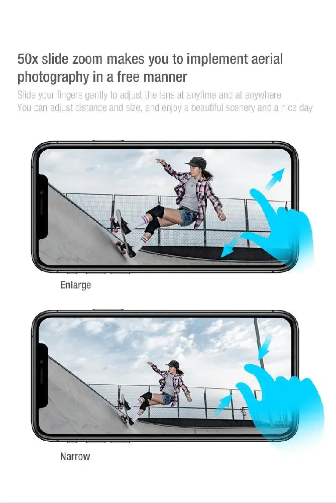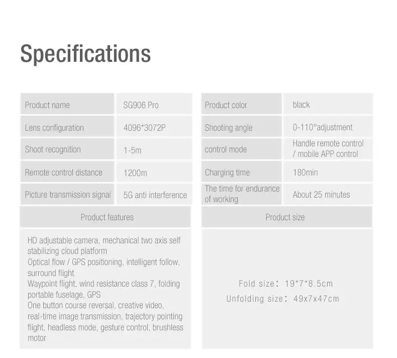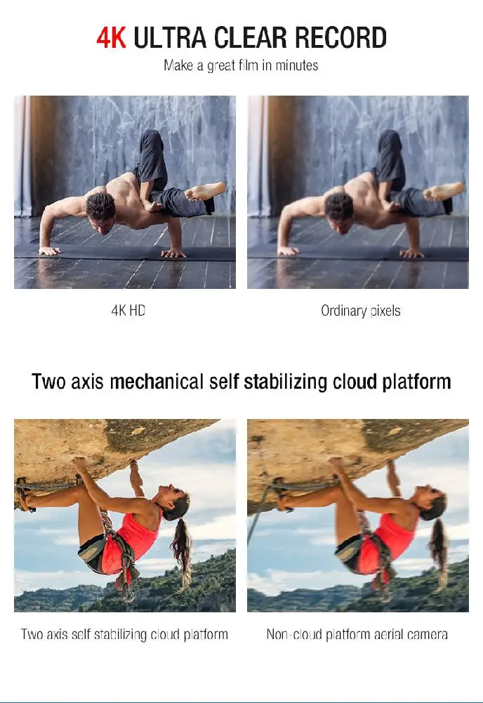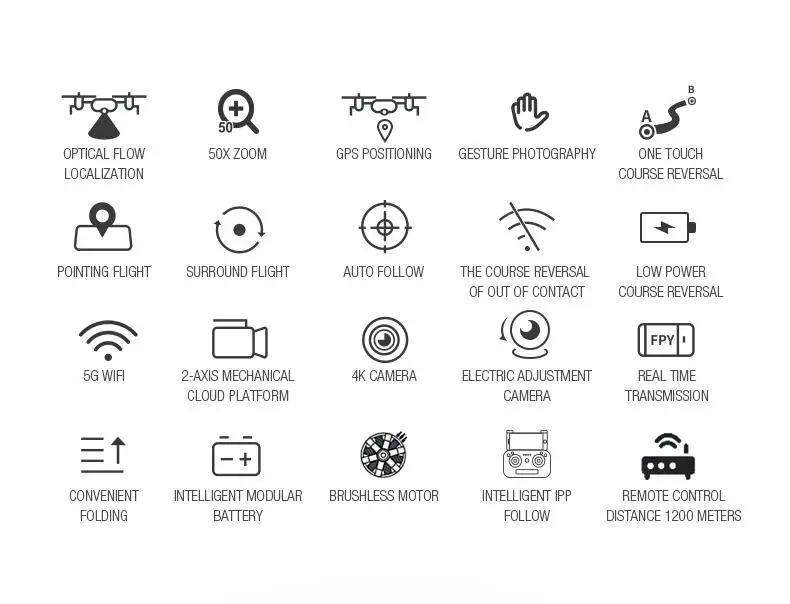 Функции: складной, запуск одной кнопкой, посадка одной кнопкой, обслуживание высоты, постоянный оптический поток, две камеры, подключение Wi-Fi, управление приложением, фотографии жестов, запись жестов, наблюдение за умным IPP, следуйте режиму me, управление ладонями (слева направо), полет в пути, точка заинтересованности, контроль скорости, передача в реальном времени, MV изображение и видео обмен, GPS возврат домой.