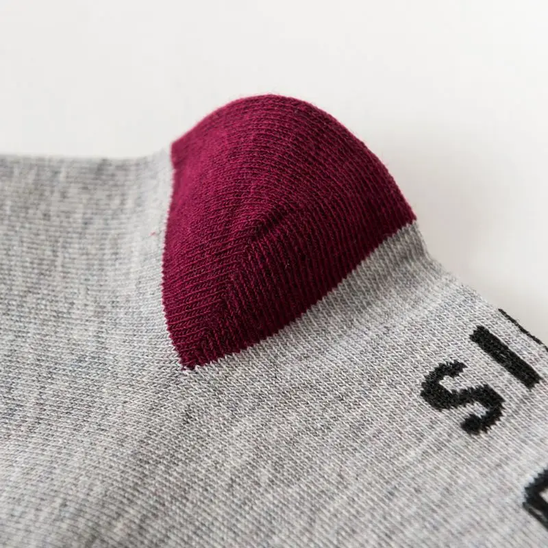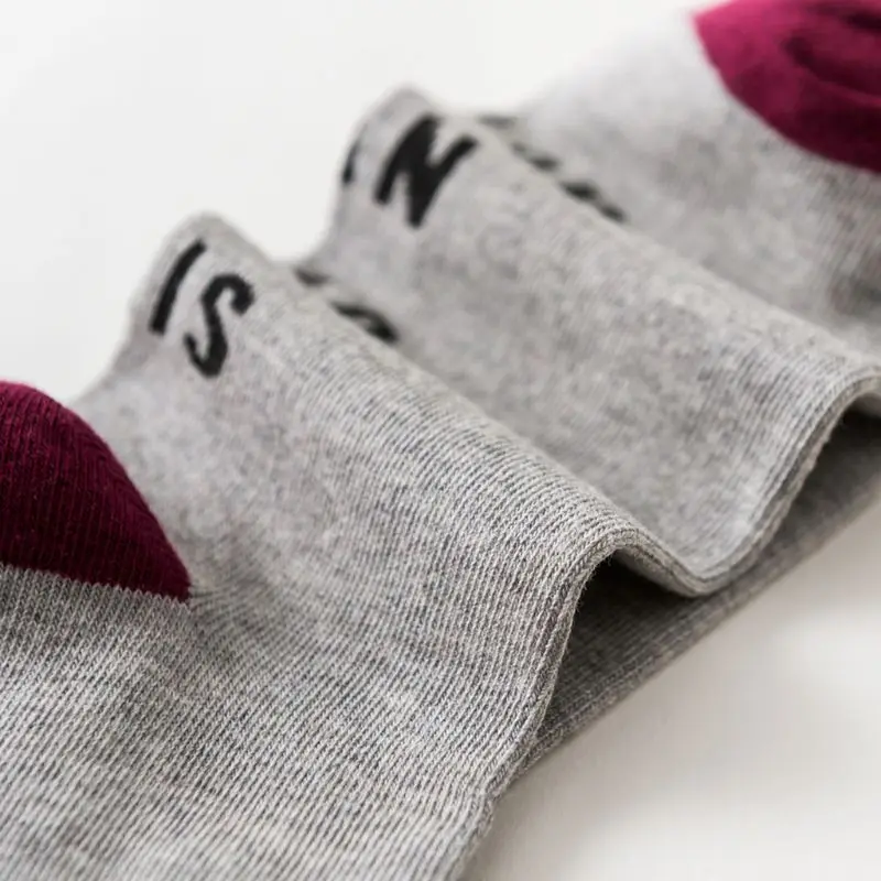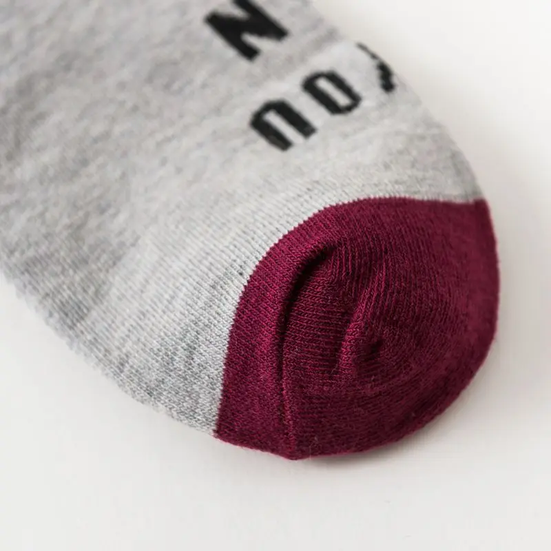 Эластичные ребристые трикотажные манжеты, контрастный цвет в полоску, забавные печатные буквы на подошве, носки без пятки до середины икры.