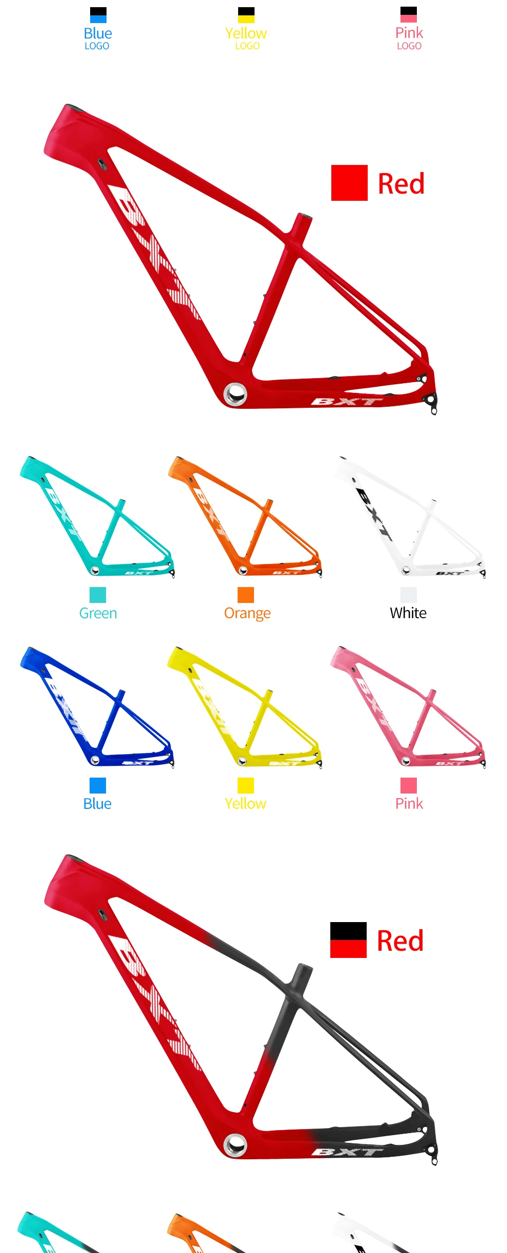 Название бренда: BXT Модель: BXT-MTB-036 Название продукта: рама для горного велосипеда из углеродного волокна 27,5 ER Отделка: глянцевая/матовая Доступные размеры: 15,5 дюйма, 17 дюймов, 18,5 дюйма, 20 дюймов BB:BSA Изделие содержит: каркас + зажим сиденья + алюминиевые детали Тормозная система: дисковый тормоз Если вам нужны пользовательские цвета или нет логотипа, пожалуйста, свяжитесь с нами. Если вы хотите купить заднюю ось 142*12 мм или гарнитуру, пожалуйста, обратитесь в службу поддержки клиентов