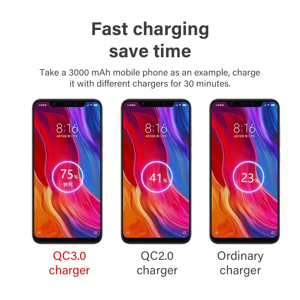 Принимает протоколы QC3.0, поддерживает быструю зарядку.