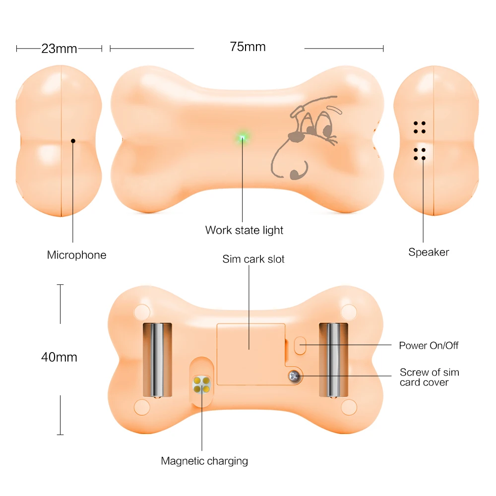 Умный трекер для домашних животных выглядит как кость собаки, которая является любимой собакой. Небольшой светильник, водонепроницаемый IP67, встроенный аккумулятор емкостью 500 мА · ч, можно заряжать 200-240 ч один раз полностью. Многорежимный GPS + WIFI + LBS + GPS + Beidou позиционирование точно, передача местоположения вашей собаки в режиме реального времени