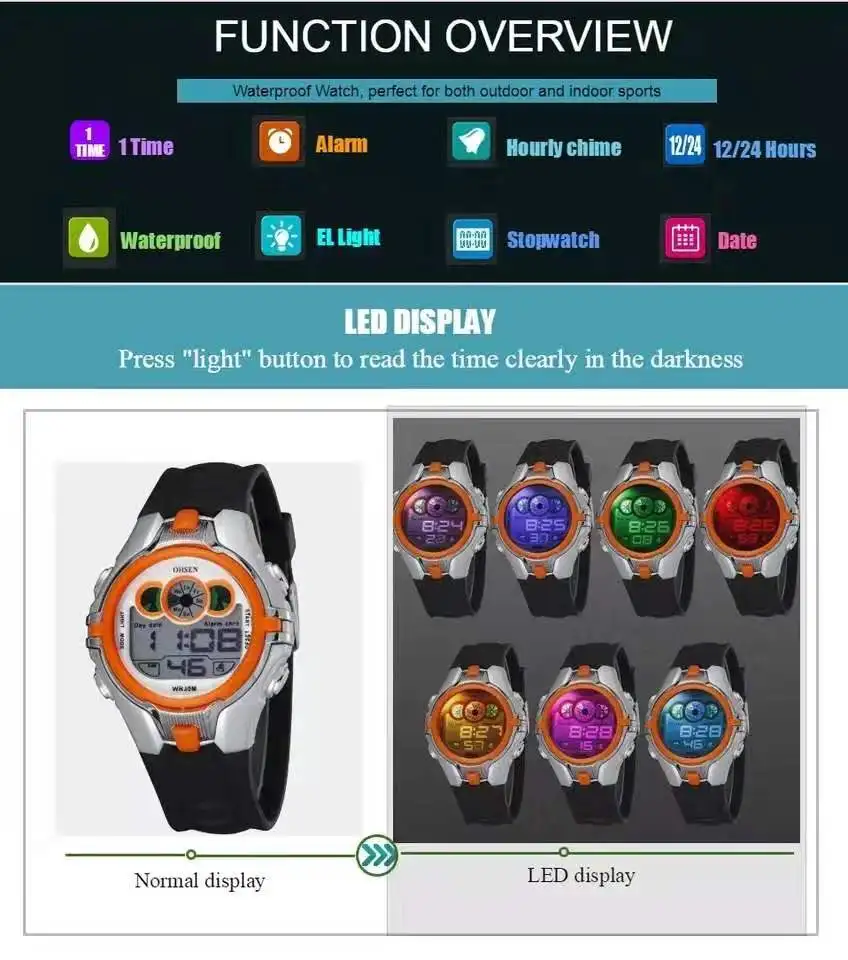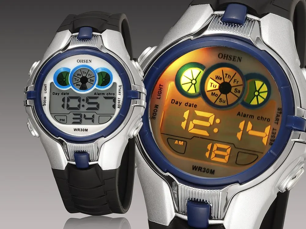 1. Серия "OHSEN" для велоспорта, привлекательное сочетание спортивного и технологического шарма. 2. Передовые технологии производства, хорошо носить и носить удобно. 3. "зазор LCD" Отображение времени в цифрах обозначает час, минуты и секунды. 4. Функция секундомера специализируется на вас, кто любит спорт. 5. Функция будильника, день и дата, 12h/24h дисплей. 6. EL подсветка (8 режимов: синий, зеленый, красный, светло-синий, 0 диапазон, фиолетовый, розовый и многоцветная вспышка) позволяет вам четко знать время в темноте. 7. Водонепроницаемость до 3 АТМ (не подходит для плавания, дайвинга, душа и т. д.) -Фирменное наименование: OHSEN -Тип дисплея: Цифровой -Диаметр корпуса: 3,8 см (1,50 ") -Толщина корпуса: 1,4 см (0,55 ") -Ширина ремешка: 2,1 см (0,80 ") -Материал ремешка: Резина -Длина ремешка (чехол входит в комплект): 23,5 см (9,25 ") -Часовой механизм: кварцевый -Водонепроницаемость: 30 метров Посылка включает в себя: 1 x Часы OHSEN Руководство пользователя (1 шт.)