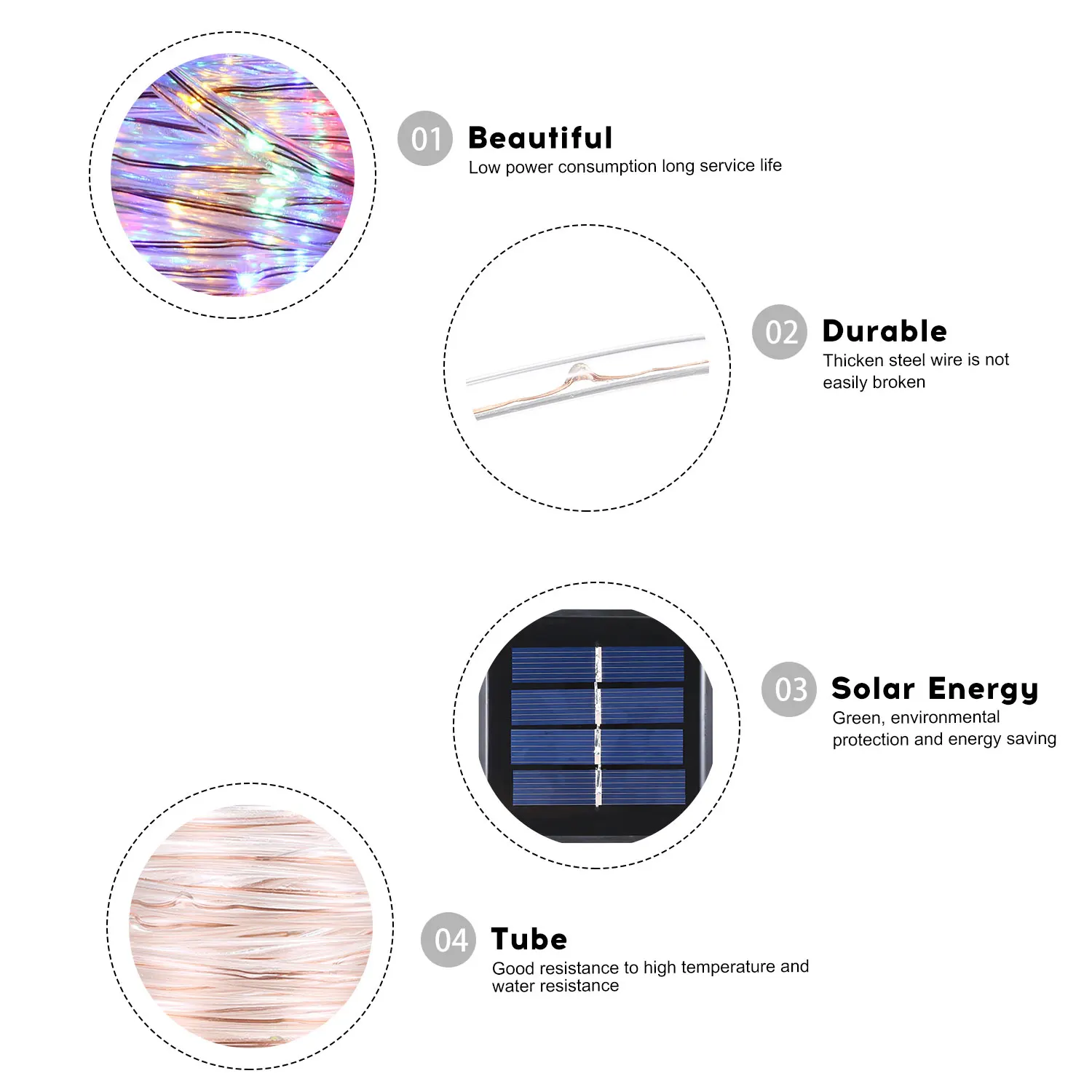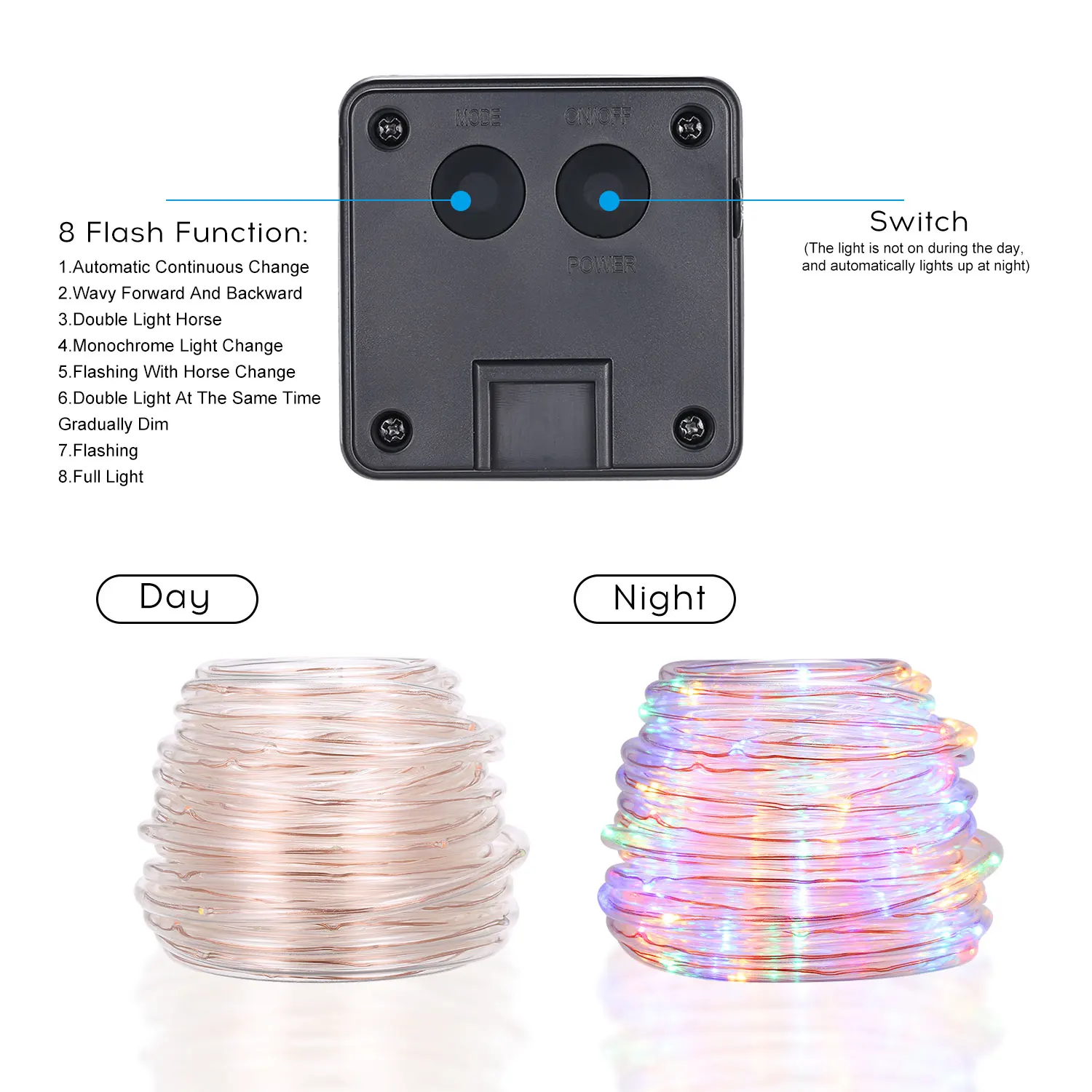 Струнный светильник обладают приятным внешним видом, светильник вес, прост в установке и быстрая в 2 шага. IP67 уровень защиты трубки, 8 видов режима вспышки, 5 типов цвета светильник, прозрачная трубка, энергосбережение и защита окружающей среды солнечный чип и большая емкость ячейки, это хорошее украшение, чтобы соответствовать требованиям различных случаев.