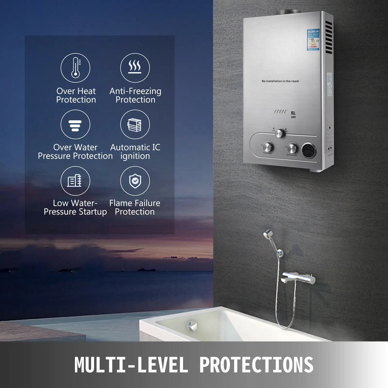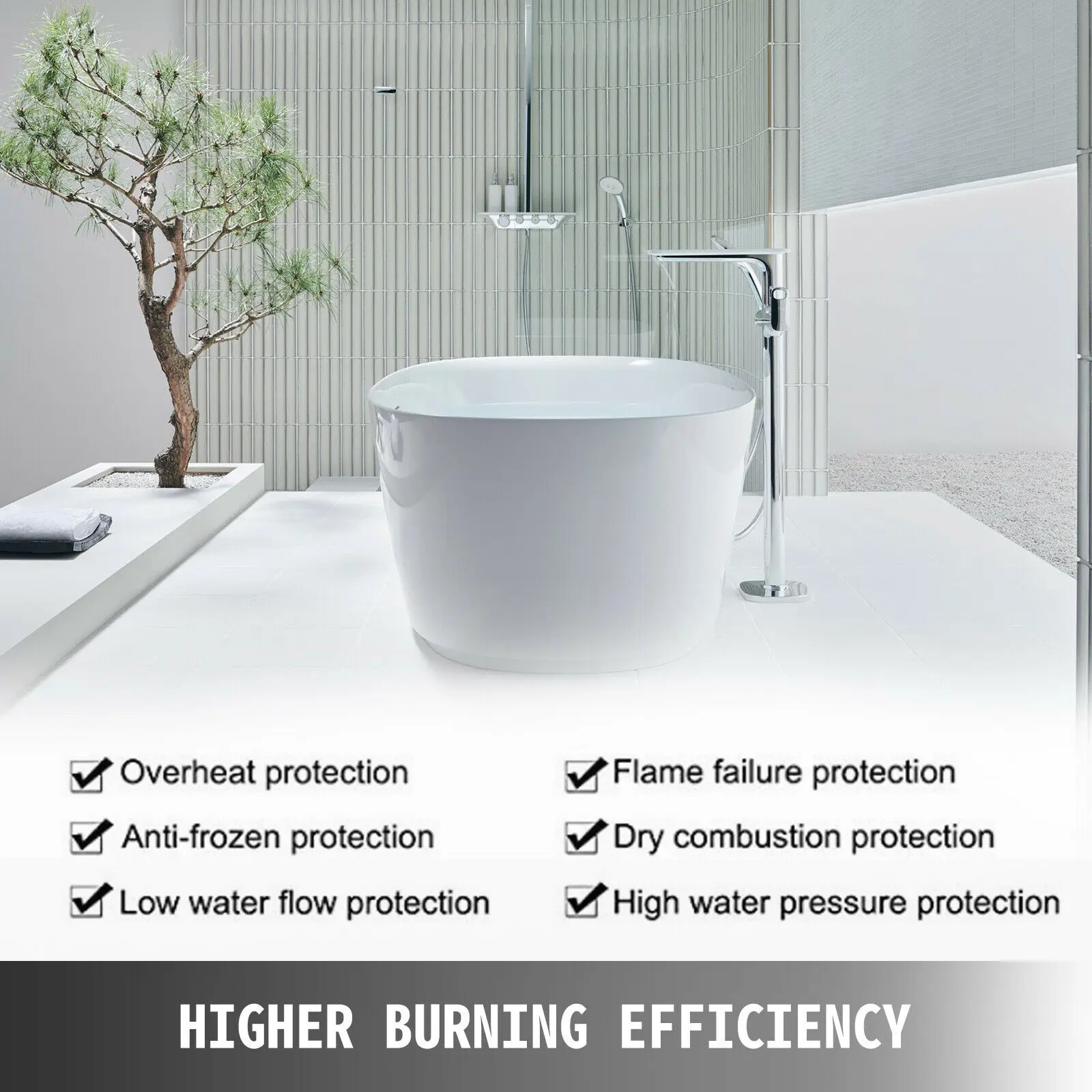 【Различные защиты 】-Обратите большое внимание на безопасность использования, поэтому используйте несколько методов защиты, таких как защита от перегрева, защита от низкого расхода воды и т. д. Этот водонагреватель также может начинаться при низком давлении воды, который поставляется с набором душевой головки в подарок.