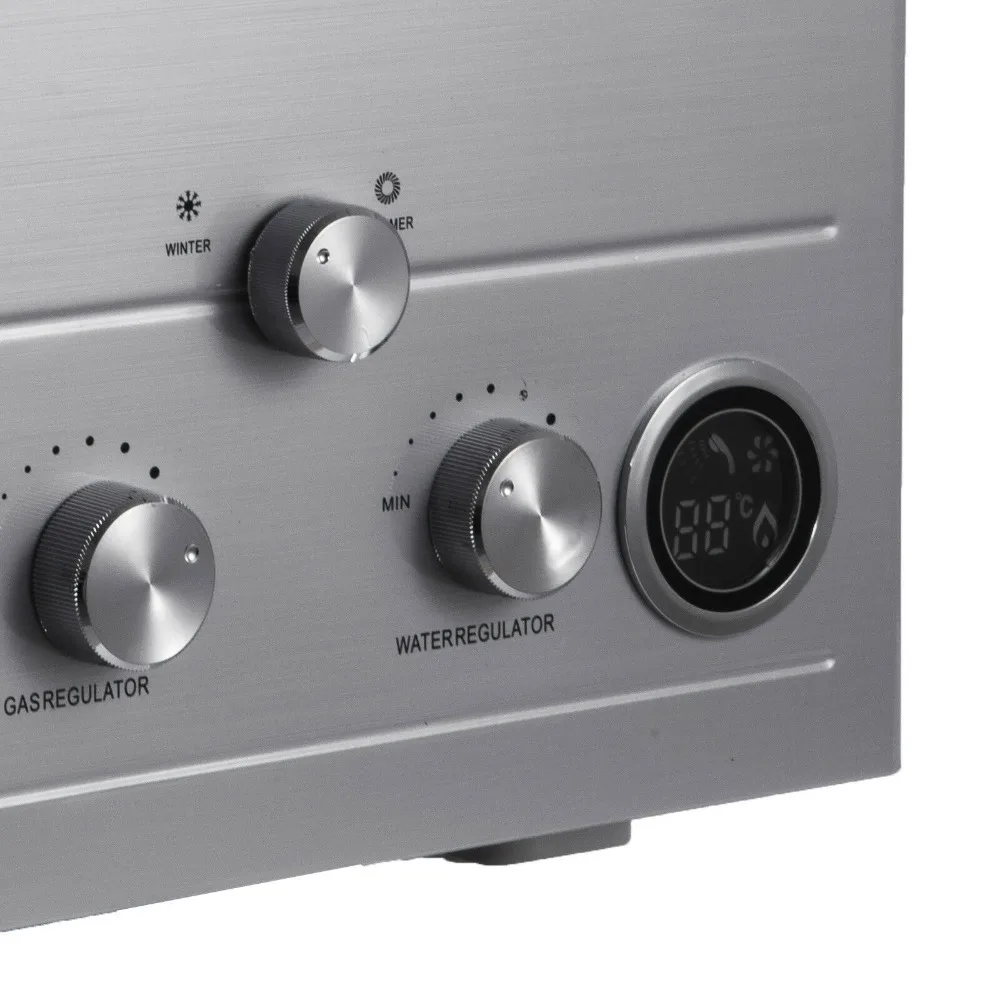 Регулятор управления газом: по часовой стрелке для увеличения подачи газа. Кнопка управления водой: по часовой стрелке, чтобы получить больше горячей воды. Кнопка «лето и зима»: предназначена для экономии энергии 40% (вырезает 1/4 рядов огня летом). Светодиодный экран для отображения температуры воды в режиме реального времени