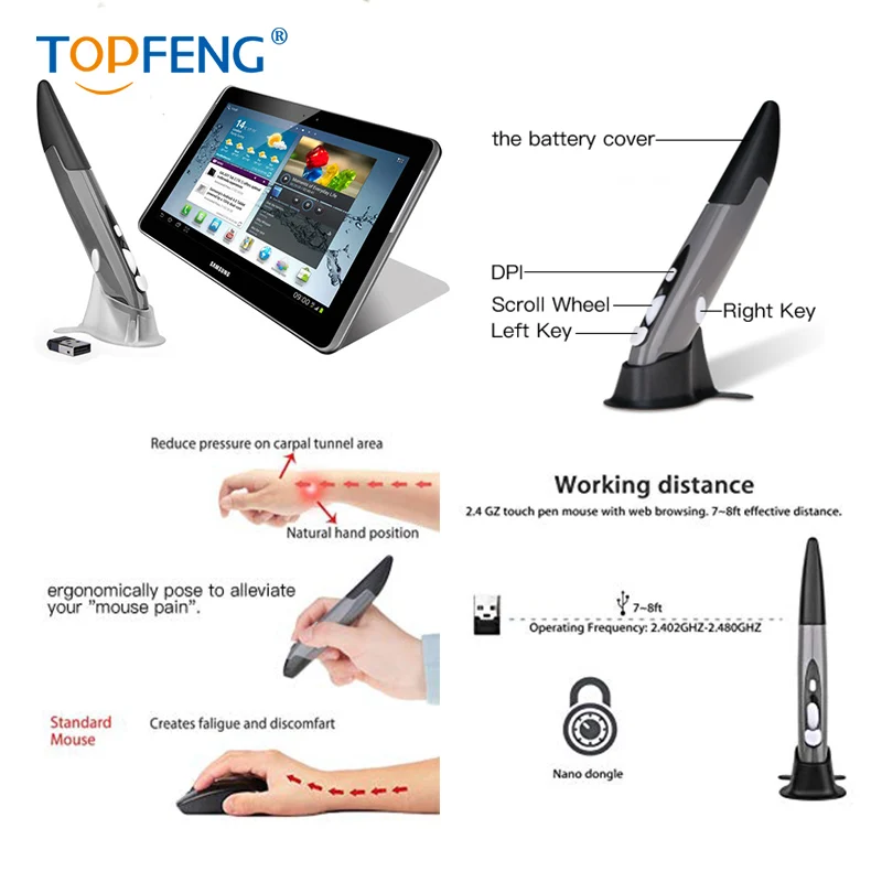 1. 2,4G Hz сенсорная ручка мышь с веб-просмотром. Около 33 футов эффективное расстояние. 2. Эргономичный дизайн: удобно сидит на руке. 3. Три регулируемых разрешения: 800/1200/1600 dpi 4. Нано-ключ 5. Поддержка 7 / 8 /10/ Vista / XP / 2000 / ME / NT 6. Совместимое устройство: Идеально подходит для ноутбуков, планшетных ПК, смартфонов. 7. Батарея: 1,5 В AAA 8. Размер: 140*20*15 мм 9. Вес: 29 г 10. Количество клавиш: 4 11. Рабочая частота: 2,402 ГГц-2,480 ГГц 12. Канал: 16 с автоматической частотой 13. Способ отслеживания: оптическая технология 14. Максимальное ускорение: 14 дюймов/с