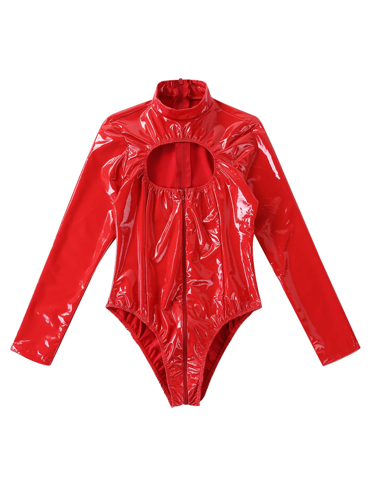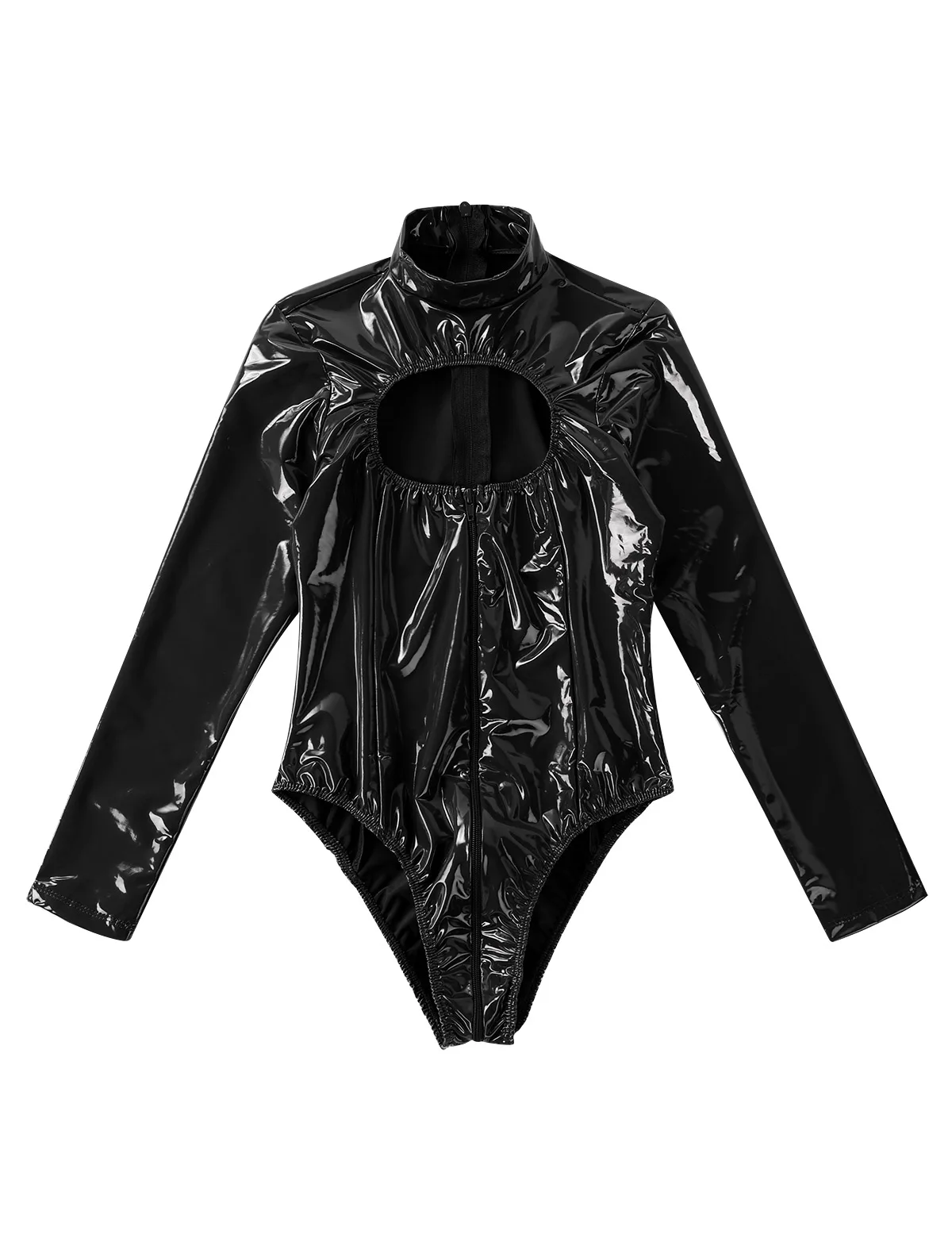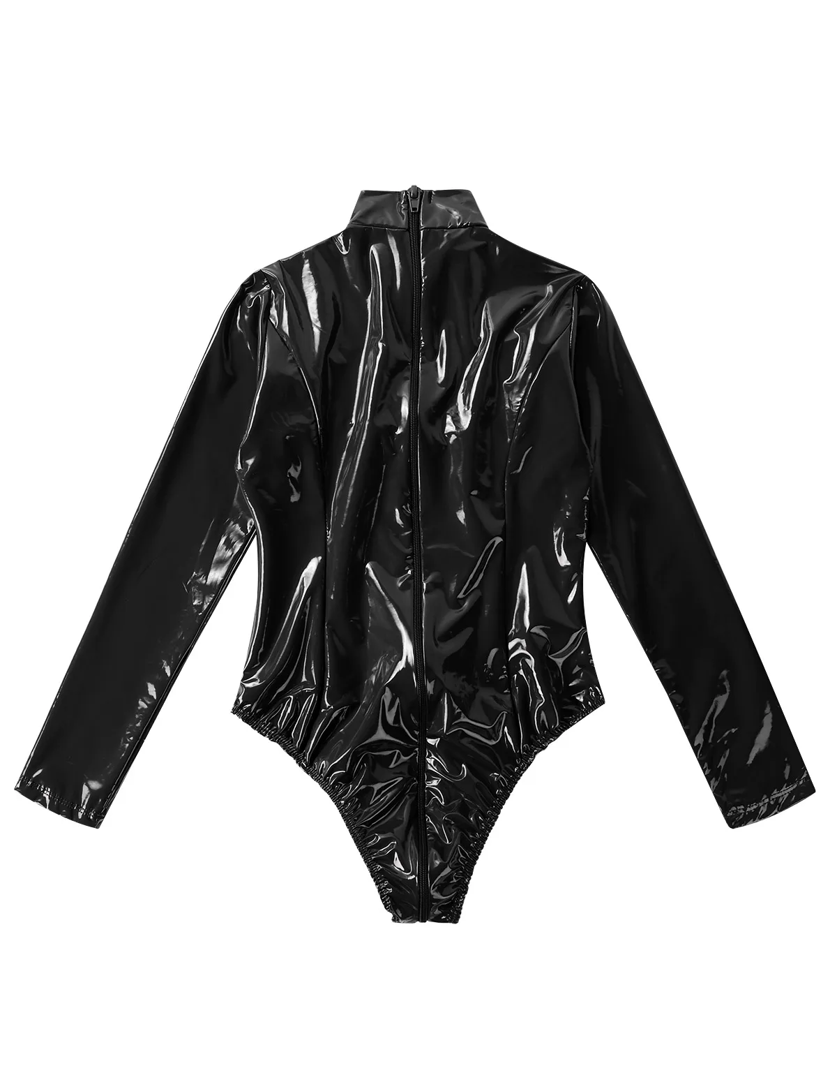 Женский Цельный боди из лакированной кожи с высоким вырезом, внешний вид мокрый.