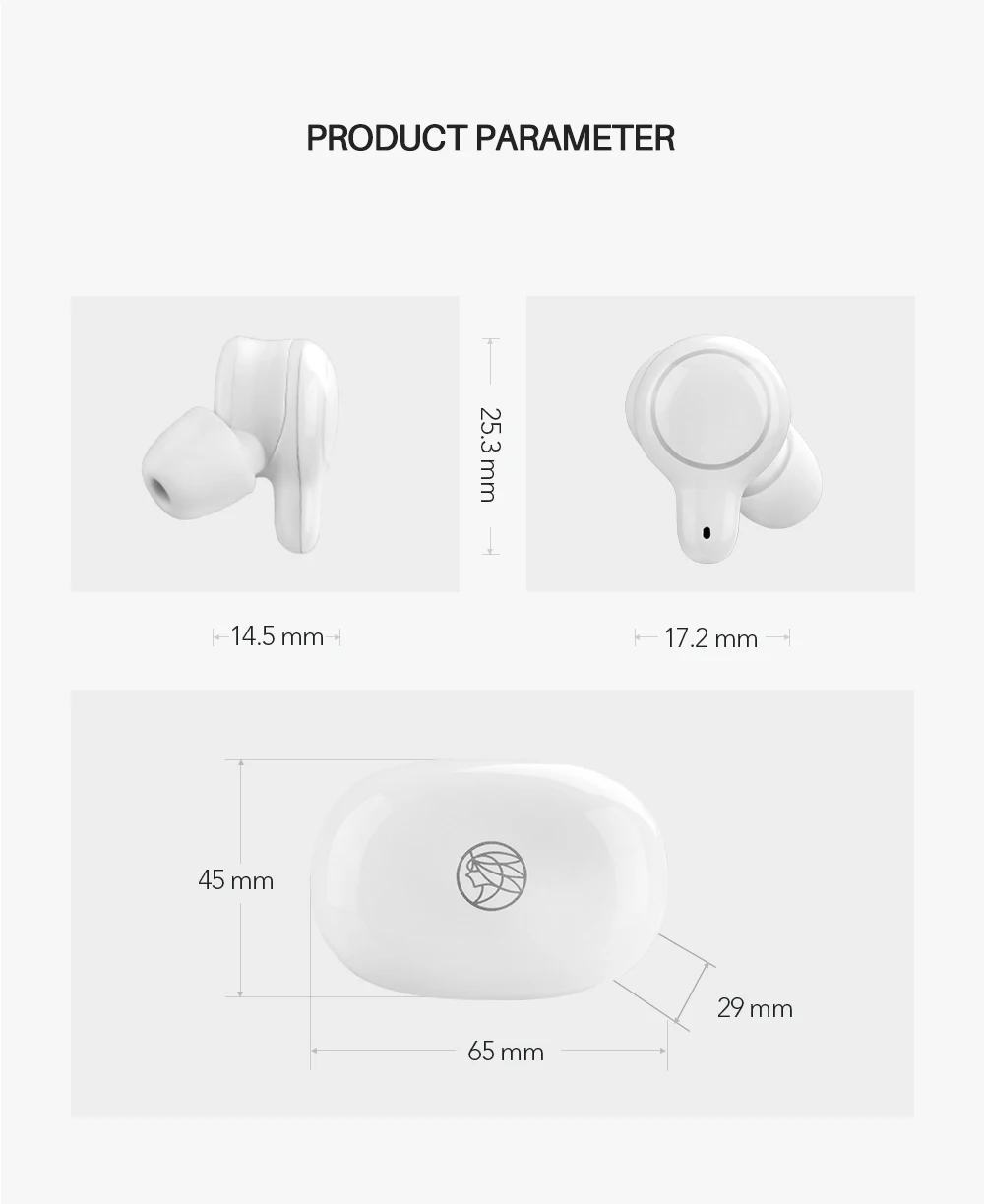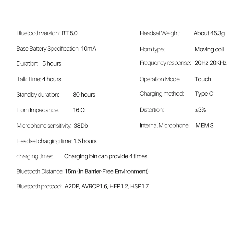 Bluetooth version: BT5.0 Bluetooth distance: 15m Bluetooth protocol: A2DP1.3/AVRCP1.6/HFP1.2/HSP1.7 Operate: Touch Driver: Dynamic Impedance: 16Ω Frequency response: 20Hz-20kHz Distortion: ≤3%(20Hz-10kHz1mW) Microphone sensitivity: -38dB Built-in microphone: MEM S Life time: 5 hours Phone call time: 4 hours Standby time: 80 hours Earphone battery: 40mA Base battery: 450mA Base battery charging times: 4 times Earphone charging time: 1.5 hours Charging method: Type-c Earphones weight: 45.3g