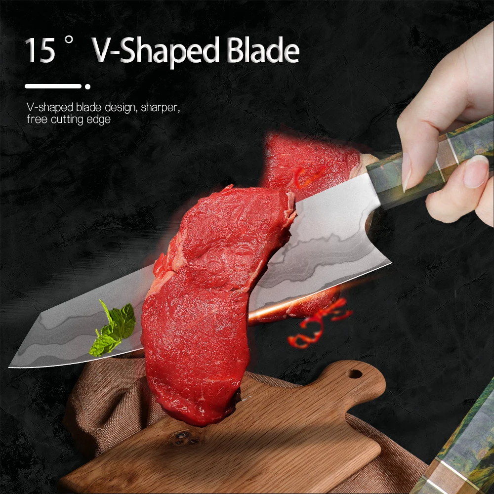 Суперострое лезвие мастерски изготовлено из 67 слоев VG-10 японской высокоуглеродистой нержавеющей стали обеспечивает исключительную прочность, долговечность и устойчивость к пятнам. V-Glod 10 японский супер стальной режущий сердечник на 62 + Твердость Rockwell. Кухонный нож, изготовленный с VG10, имеет лучшую прочность, удержание, остроту.