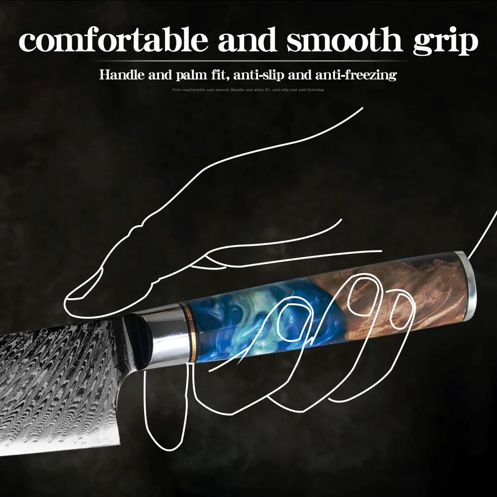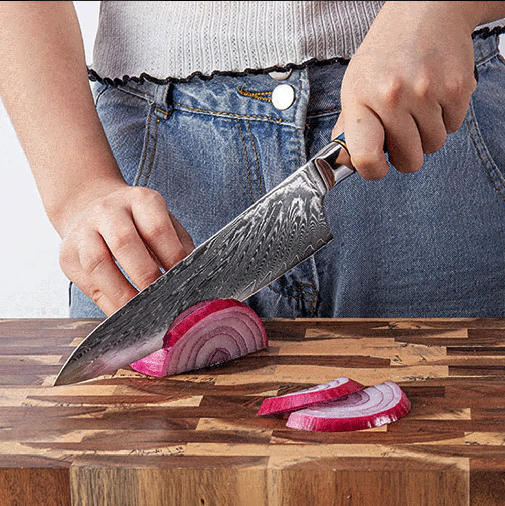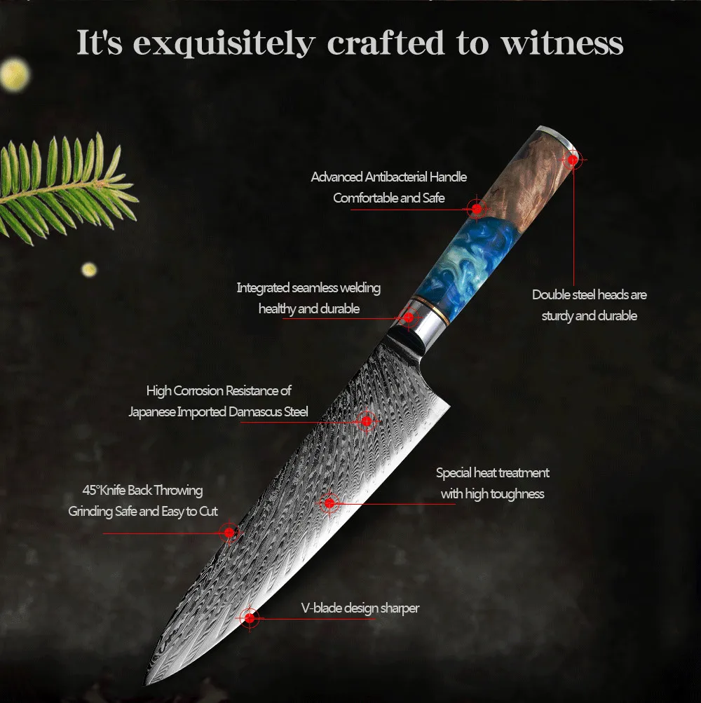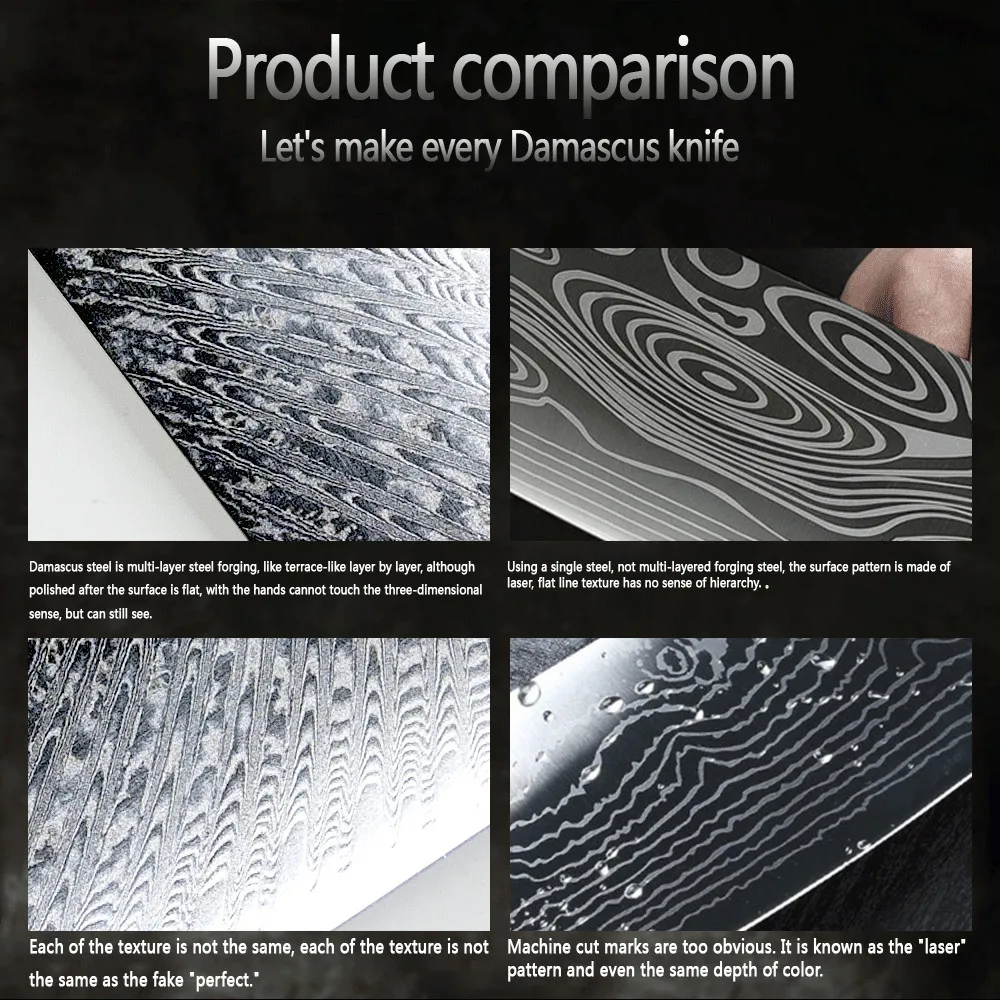 Супер острое лезвие искусно изготовлено из 67 слоев VG-10 японской высокоуглеродистой нержавеющей стали обеспечивает исключительную прочность, долговечность и устойчивость к пятнам. V-Glod 10 японский супер стальной режущий сердечник с твердостью 62 + Rockwell. Кухонный нож, изготовленный с VG10, имеет лучшую прочность на края, удержание, остроту.