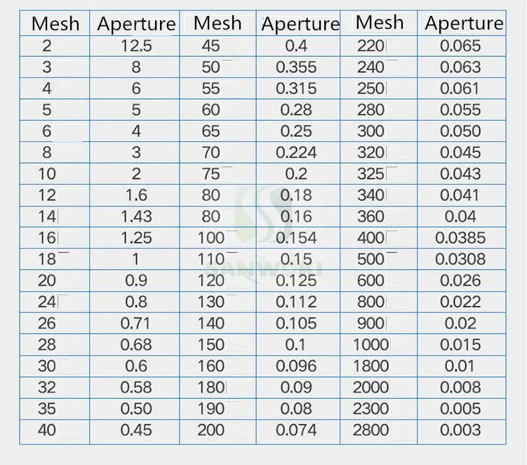 Сетка для трафаретной обработки: мука 30-50 сетка, 40 сетка для торта, 10-24 Сетка для муки; 20-50 сетка для муки; 50-80 сетка для китайской медицины; 120-180 сетка для порошка жемчуга; Порошок 100-140 сетка; 3D печать 316 порошок 300-500 сетка; Целлюлоза 80-100 сетка; Линия порошок 100-140 сетка.