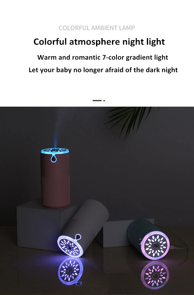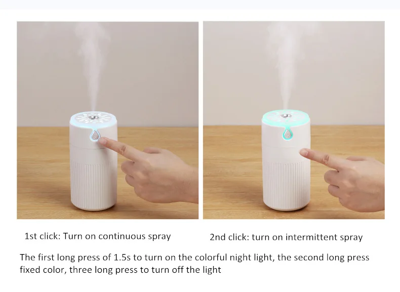 1-й щелчок: Включите непрерывный распылитель 2-й щелчок: Включите прерывистый распылитель первый длинный пресс 1,5 s, чтобы включить красочный ночной Светильник, второй длинный нажмите фиксированный цвет, три длинных нажатия, чтобы выключить светильник