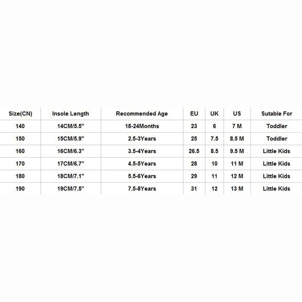 Размер (CN) Стельки Длина Рекомендуемый возраст ЕС Великобритания Свяжитесь с нами Удобен для 140 14 см/5,5" 18-24Months 23 6 7 м Для детей ясельного возраста 150 15 см/5,9" 2,5, для возраста до 3 лет 25 7,5 8,5 м Для детей ясельного возраста 160 16 см/6,3" 3,5-4 лет 26,5 8,5 9,5 м Дети дошкольного возраста 170 17 см/6,7" 4,5-5 лет 28 10 11 м Дети дошкольного возраста 180 18 см/7,1" 5,5-6 лет 29 11 Размеры от 12 мес. Дети дошкольного возраста 190 19 см/7,5" 7,5-8 лет 31 12 13 м Дети дошкольного возраста