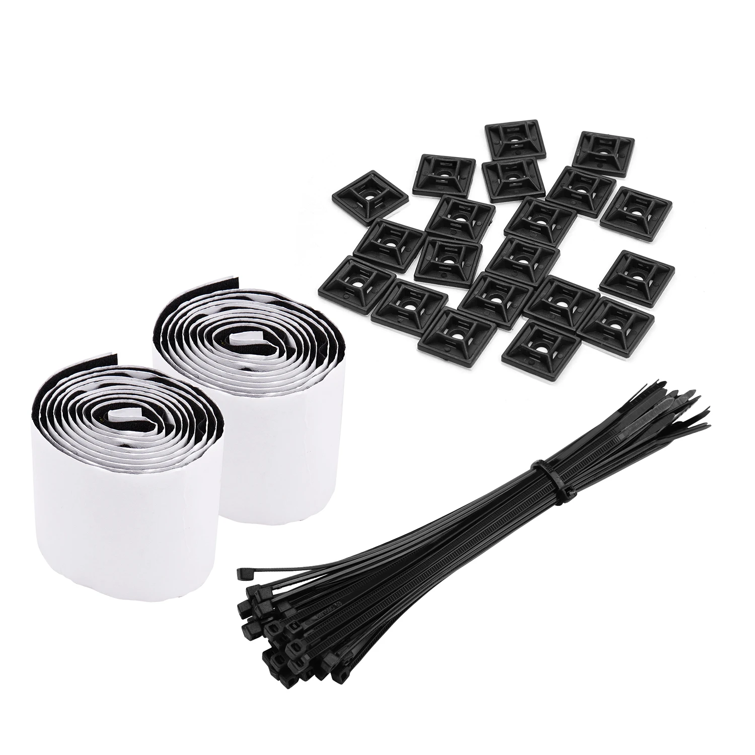 Набор органайзеров для проводов включает в себя две крепежные ленты длиной 1 метр, 20 монтажных зажимов и 40 стяжек на молнии.