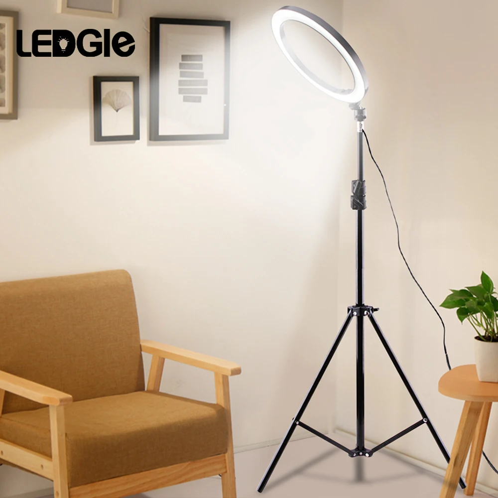 Бренд: LEDGLE Материал: алюминиевый сплав и пластик Напряжение: 5 В постоянного тока Мощность скорость: 5 Вт или 12 Вт 3 цвета температуры: теплый белый светильник, холодный белый светильник и белый светильник Яркость: 10 уровней Диаметр кольцевой светильник (приблизительно): 6,30 "/16 см или 10,2"/26 см Высота штатива (приблизительно): Макс 19,69 "/50 см или макс 63"/160 см или max 82,7 "/210 см Длина кабеля USB (прибл.): 6.6 футов/2 м