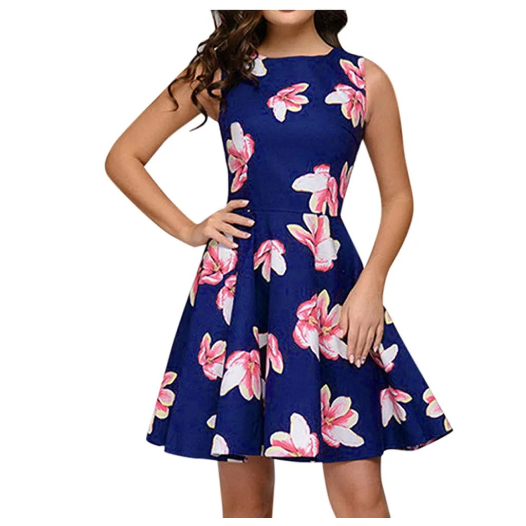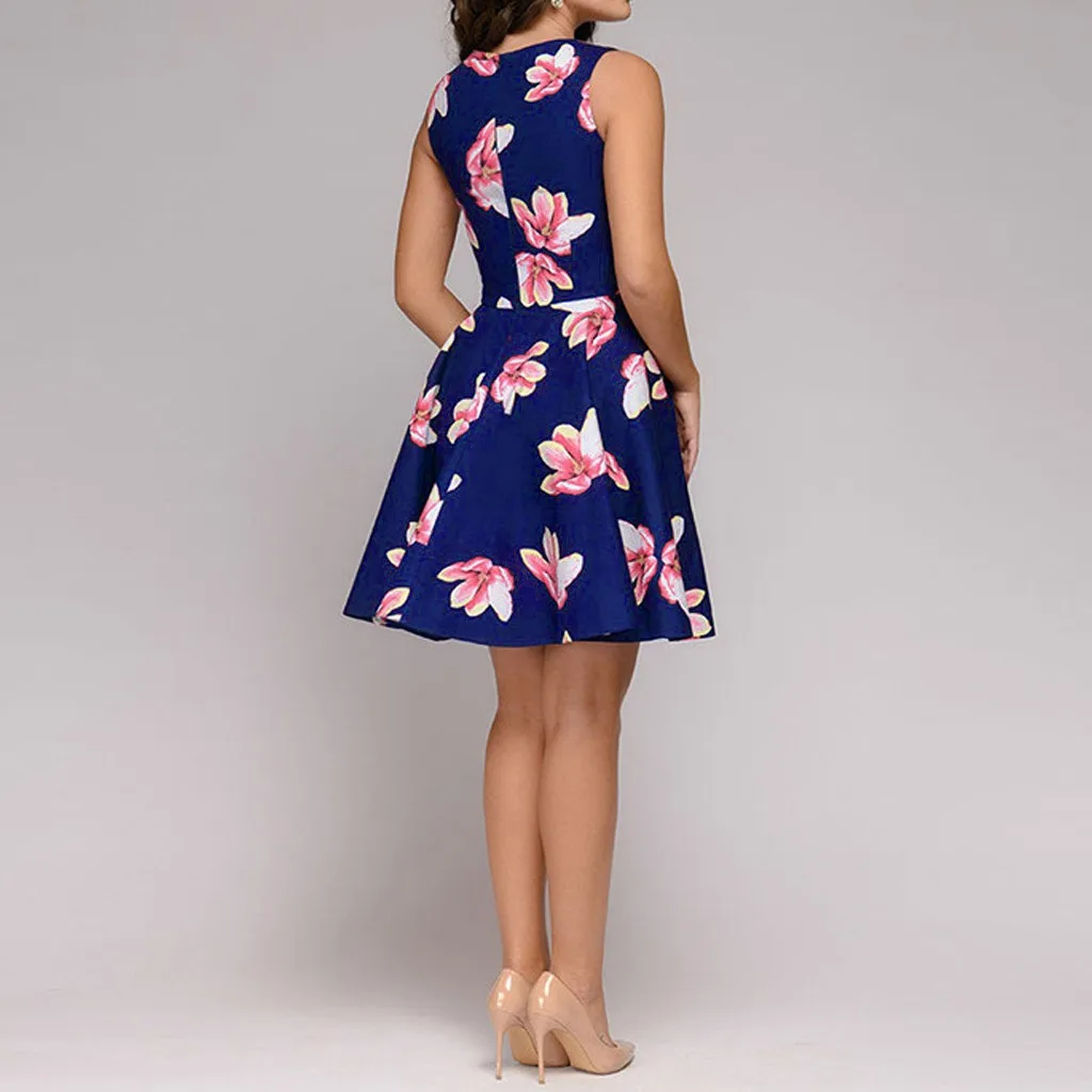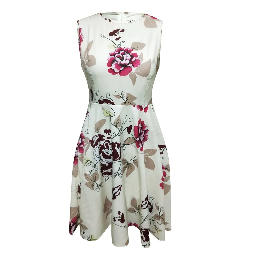 Женское платье без рукавов, с цветочным принтом, круглым вырезом и карманами