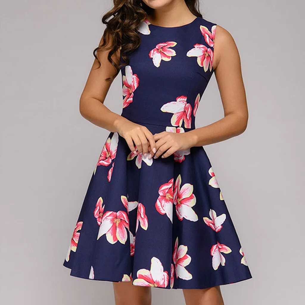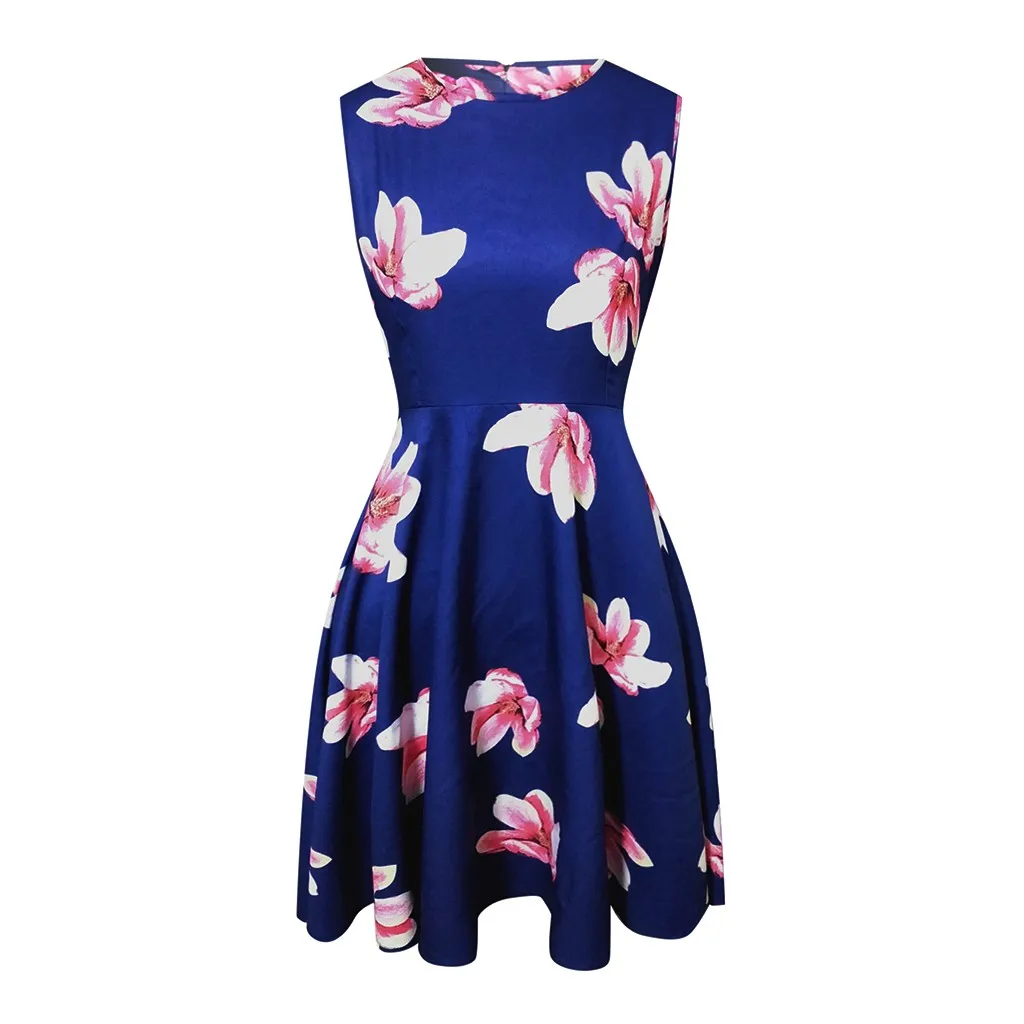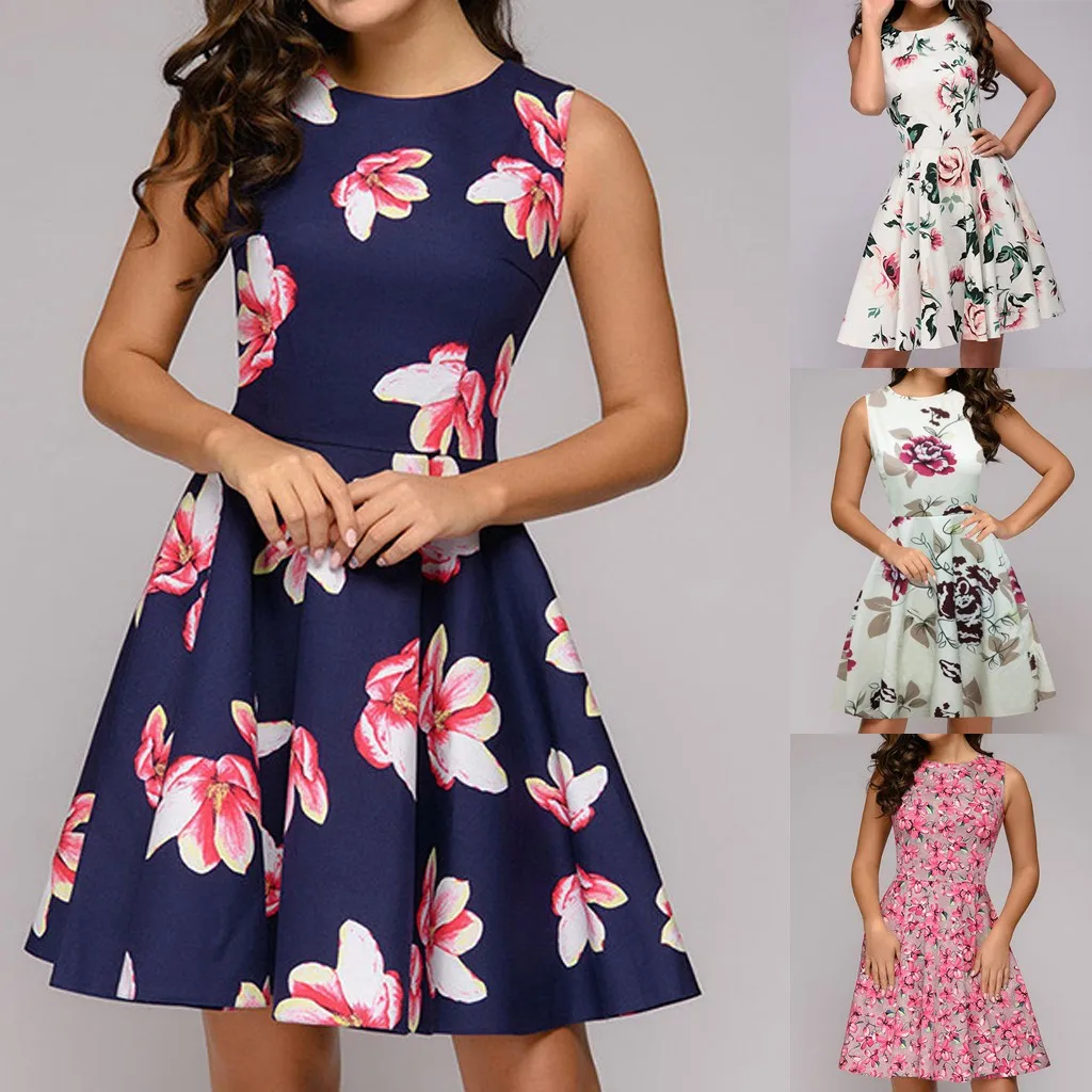 Женское платье без рукавов, с цветочным принтом, круглым вырезом и карманами