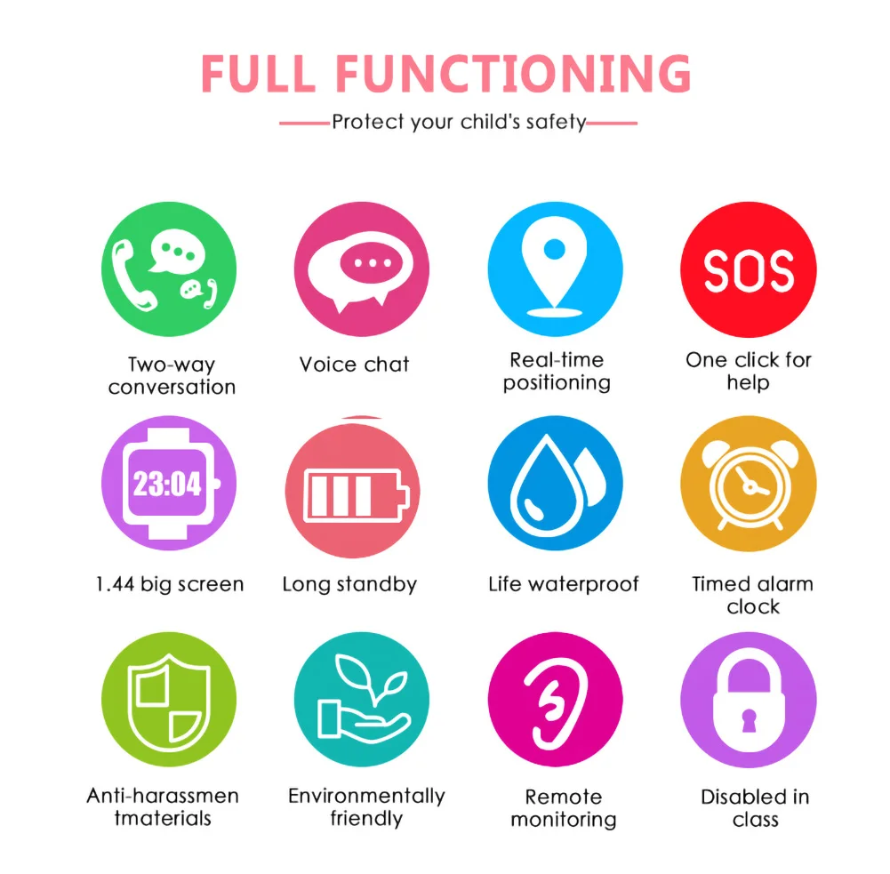 Аварийная сигнализация SOS, удаленное отключение, Безопасная зона, сигнализация с низкой батареей, голосовой мониторинг, историческая дорожка, голосовая связь, награда любви, будильник часов