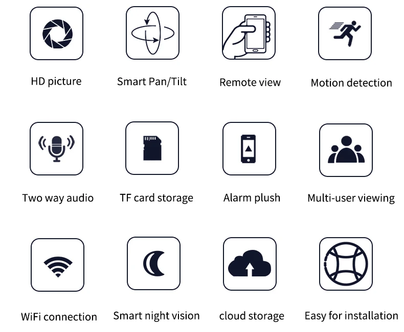● HD картинка/умный панорамирование/наклон ● Удаленный просмотр/Обнаружение движения ● Двустороннее хранение аудио/TF карт ● Плюшевая сигнализация/просмотр нескольких пользователей ● Подключение Wi-Fi/умное ночное видение ● Облачное хранилище/Простота установки