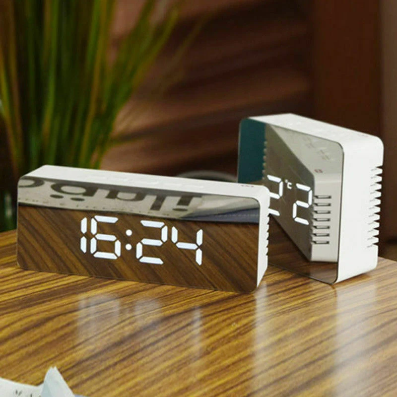 <Многофункциональный> дизайн зеркального стиля, большой цифровой дисплей, 12/24 часов, будильник, Повтор, отображение температуры (°C/°F), ночной режим и зеркало, мягкий свет не будет мешать спать ночью.