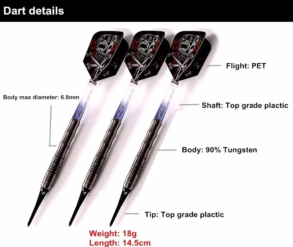 Дротика: 90% вольфрамНаконечники для дротиков: СМПВал Дротика: нейлонДротика: PETМаксимальный диаметр ствола Дротика: 6,8 ммОбщий вес: 18 г (включая наконечник, цилиндр, вал, полет)Общая длина: 14,5 смКожаный чехол в комплекте:3 × дротики9 × полеты3 × нейлоновые валы3 × защита для Дротика3 × Дротика мягкие наконечники1 × точилка для Дротика1 × инструмент для метания дротиков1 х кожаный чехол(Вы можете оставить сообщение, чтобы выбрать цвет коробки, черный, коричневый, розовый)