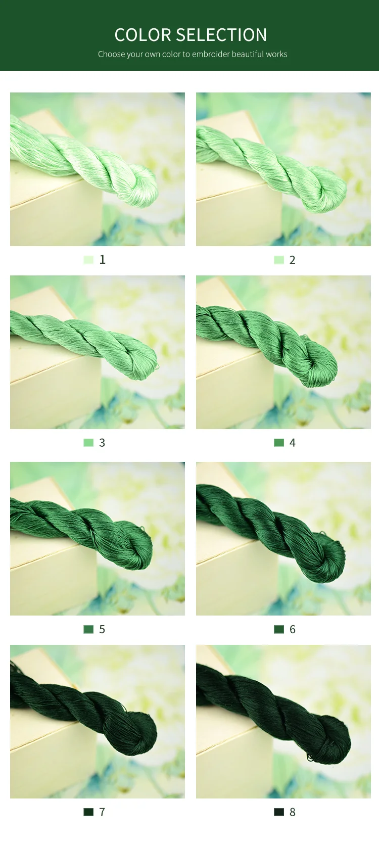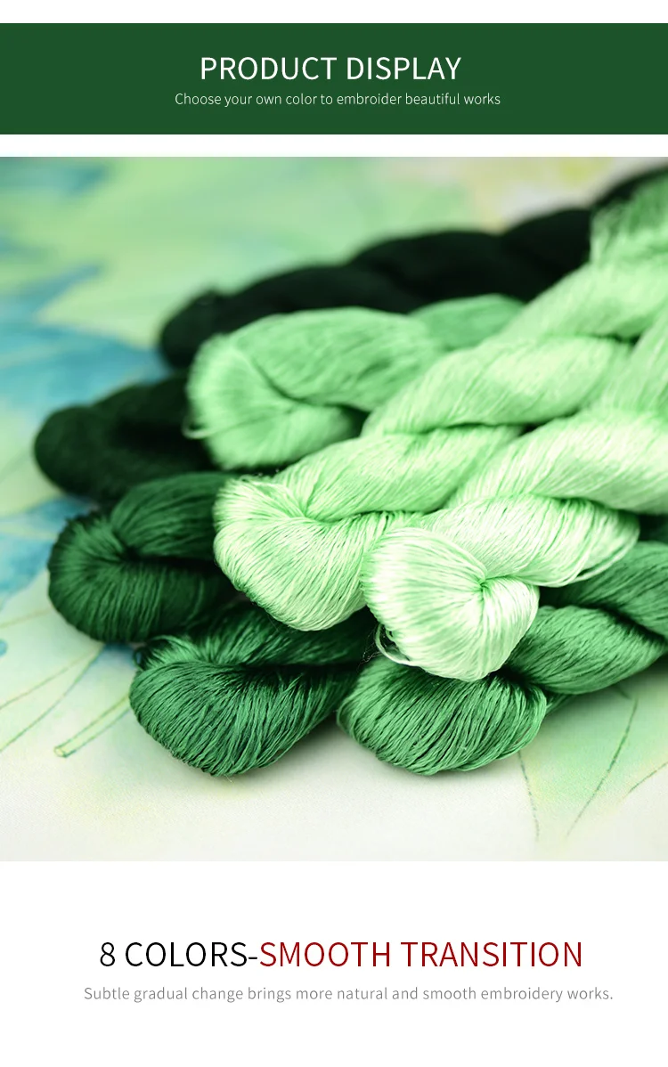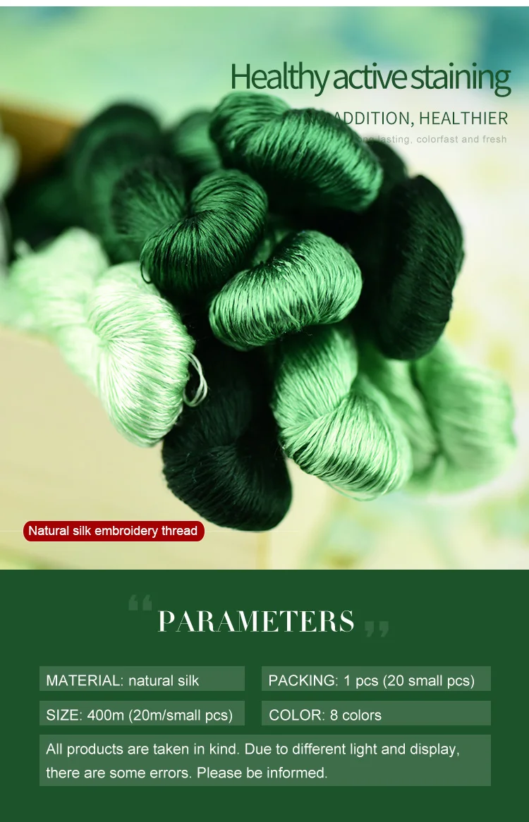 400 м чистый цвет вышивки нитки поделки, ручная вышивка/аксессуары ручной работы/изумрудно-зеленая серия Особенности: 1.100% шелк и высокое качество, подходит для Сучжоу ручной вышивки. 2. Длина: 400 метров (20 метров/маленький кусок) 3. У вас есть восемь цветов на выбор 4. Пожалуйста, обратите внимание, что в зависимости от дисплея, продукт может производить некоторые различия в цвете, пожалуйста, знать и понять эту ситуацию. Упаковка: 1 шт. (включая 20 маленьких штук)