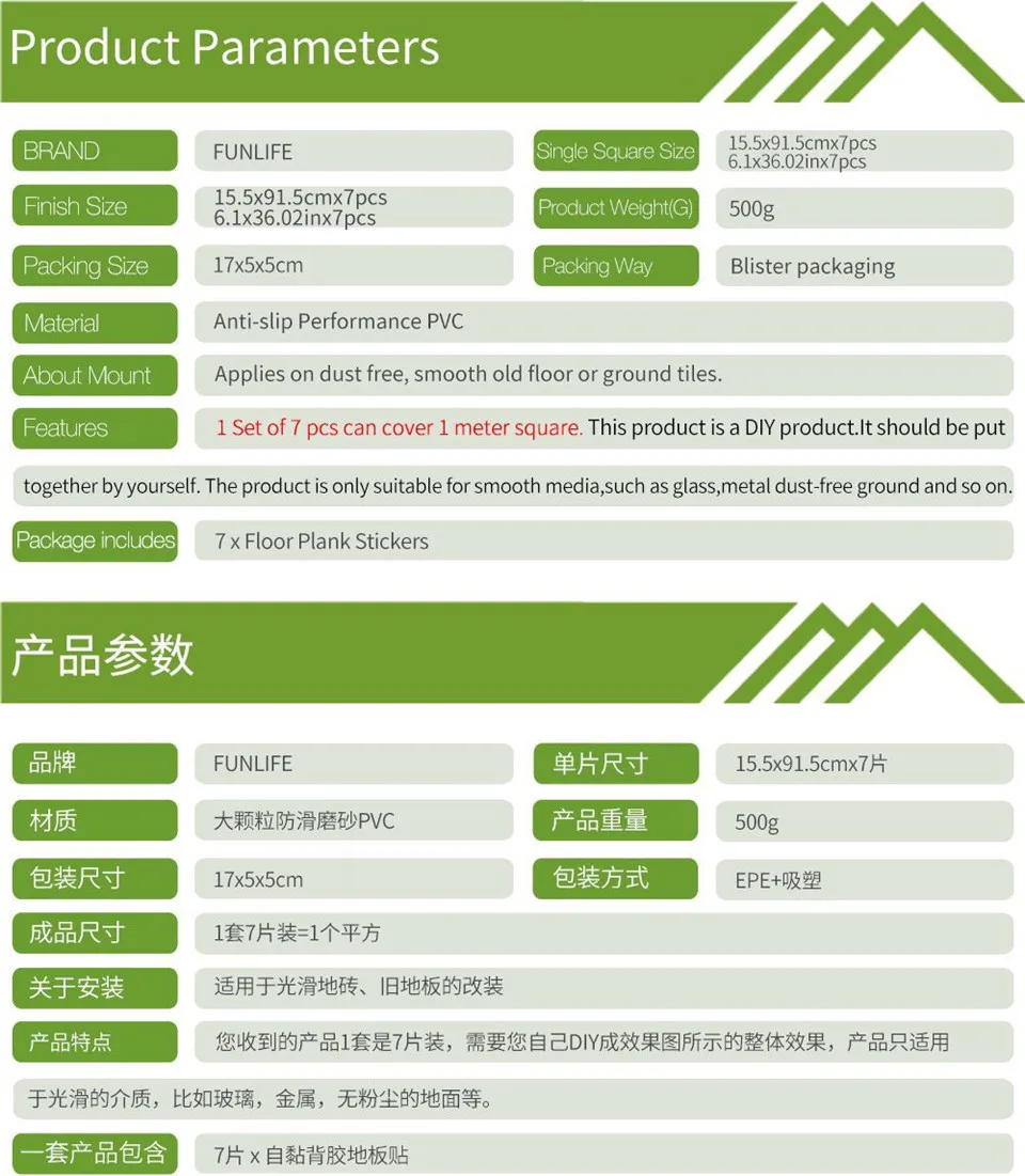 1. Материал: Противоскользящий материал ПВХ 2. Размер: 15.5x95.5cmx7pcs,(7 шт. около 1 квадратный метр) 3. Стиль: 3D яркие деревянные наклейки для плитки 4. Функции: напольное украшение, ремонт напольной керамики