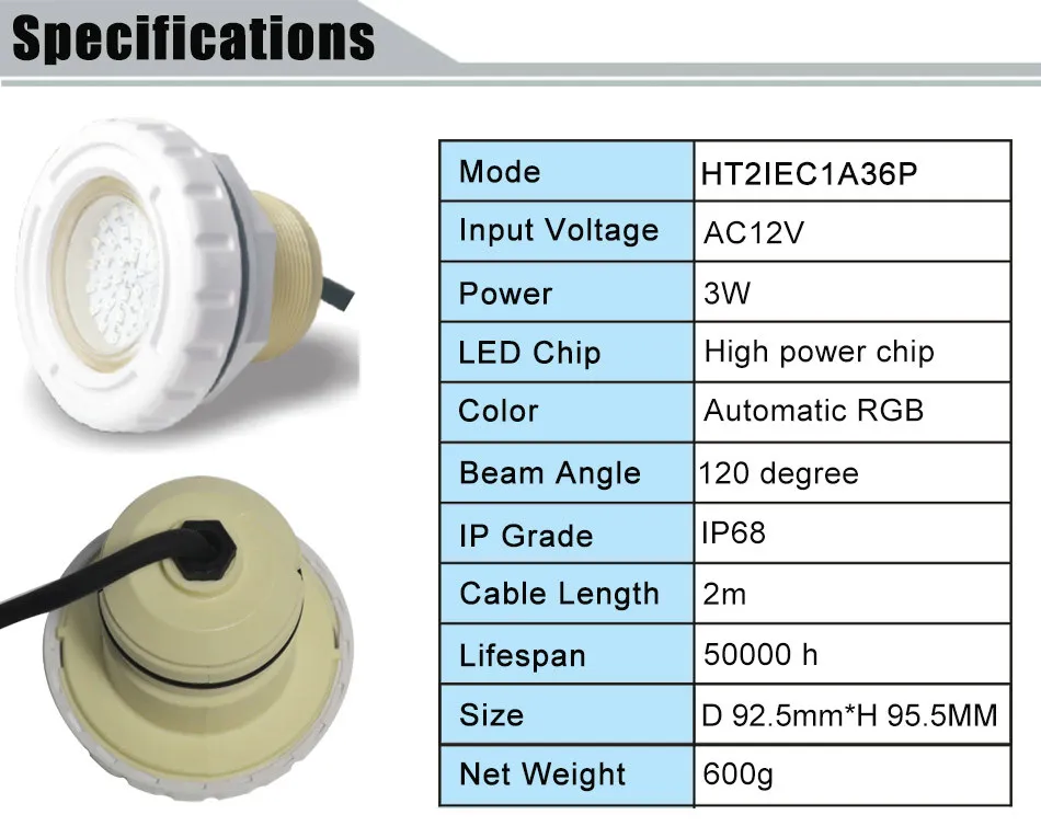 Применение: Этот подводный светильник является идеальным решением для декоративного освещения водных пейзажей и освещения. Идеально подходит для проектного освещения. Он идеально подходит для бассейна, джакузи, прудов, фонтанов, аквариумов, развлекательных объектов, украшения под водой, паркового озера, водной сцены и других открытых мест для украшения атмосферы. Технические характеристики: 1. Мощность: 3 Вт/9 Вт 2. Световой поток: 100 лм/Вт 3. Напряжение: RGB: AC/DC12V; Один цвет: AC/DC 12 В 4. Степень защиты от попадания: Водонепроницаемость IP68 (можно поместить в Водонепроницаемость напрямую). 5. Угол луча: 60 градусов 6. Длительный срок службы: 50000 часов 7. Светодиодный Температурный режим: от-20 до + 40 градусов по Цельсию 8. Размер: 85 мм D95 * h92мм 9. Длина шнура: 100 см Посылка включает в себя: 1 шт. 3 Вт или 9 Вт светодиодный подводный светильник