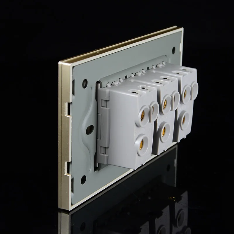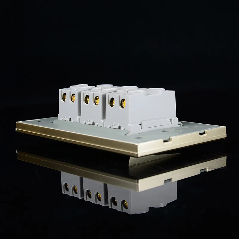 Название продукта: 118 мм 3-канальный 1/2 ходовой выключатель питания с золотым проводом Размер продукта: 118*74 мм Рабочее напряжение: 250 В, 16 А Материал гнезда: поликарбонат огнестойкий + латунь Гарантийный срок: 10 лет Сертификат: CE / Rosh / CCC