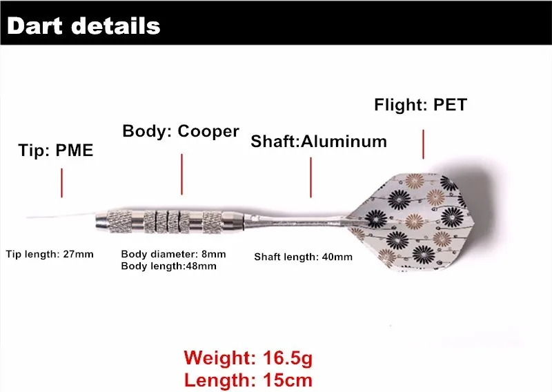 3 шт./компл. Наконечники для дротиков: ПКО Длина наконечника: 27 мм Тело Дротика: железо Максимальный диаметр корпуса: 8 мм • Длина: 55 мм Вал Дротика: алюминий Длина вала: 35 мм Полет Дротика: алюминиевая фольга Общий вес: 20 г (Включая наконечник, цилиндр, вал, полет) Длина: 15 см